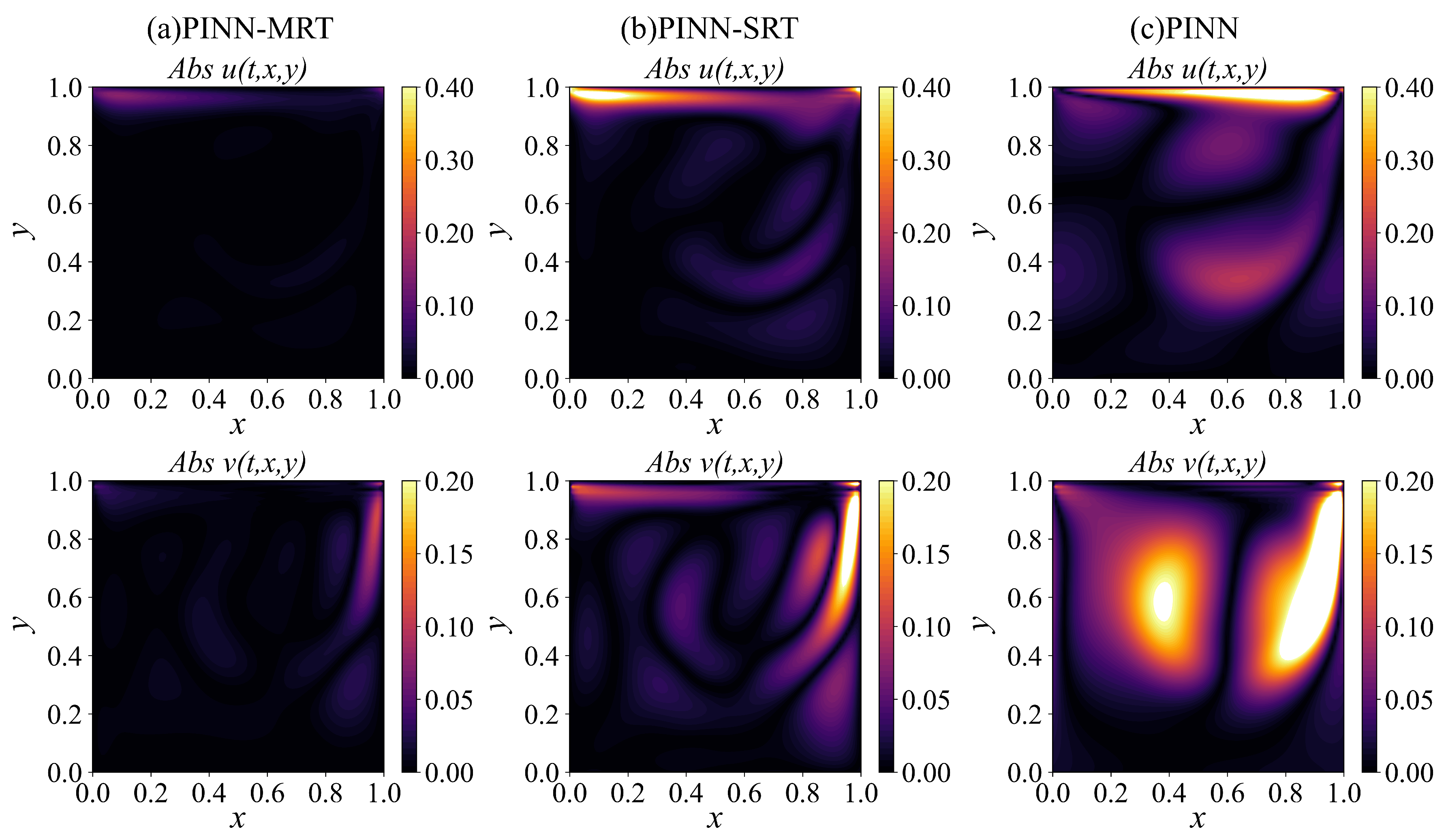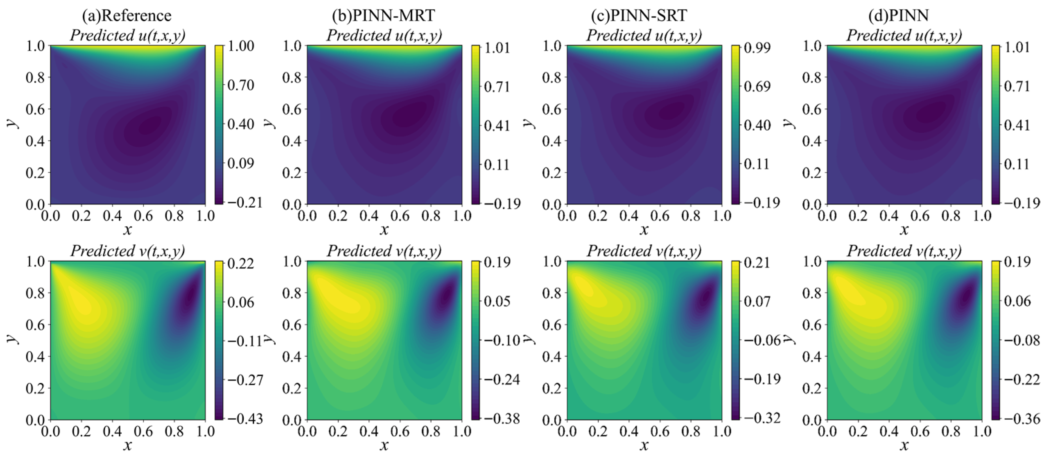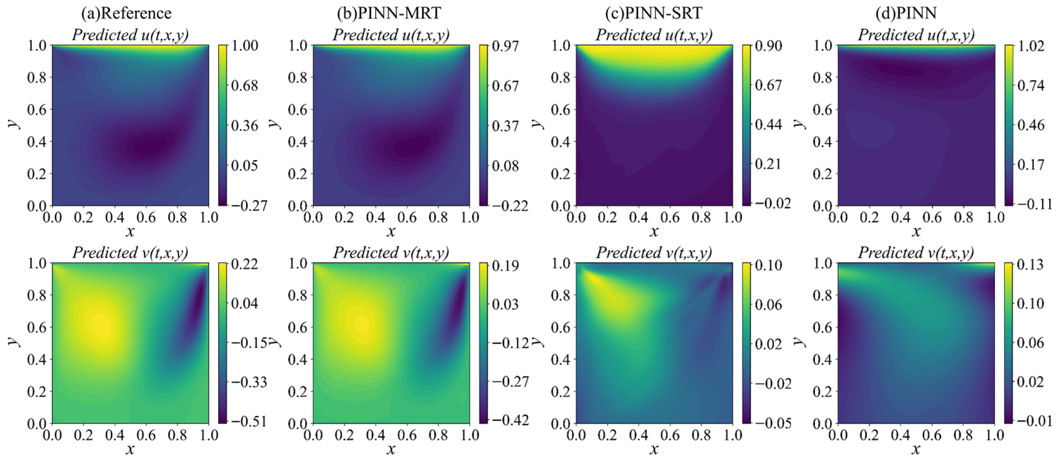 Despite the demonstrated advantages, several limitations of the present study should be acknowledged. First, the proposed PINN-MRT framework incurs a relatively high computational cost due to the dual-network structure and the additional mesoscopic constraints, and its scalability to large-scale or real-time simulations has not yet been systematically assessed. Second, a formal analysis of error propagation from the MRT relaxation parameters to the macroscopic PINN outputs remains to be developed, which would provide deeper insights into the sensitivity and robustness of the coupled learning process. Third, the current validation is limited to two-dimensional, single-phase steady flows, and the extension to three-dimensional or multiphase configurations requires further investigation. Finally, the present work employs fixed weighting coefficients in the composite loss function; introducing adaptive weighting schemes could further improve convergence efficiency and balance among competing physical constraints. Addressing these aspects constitutes an important direction for future research toward a more general, efficient, and physically consistent PINN-MRT framework.