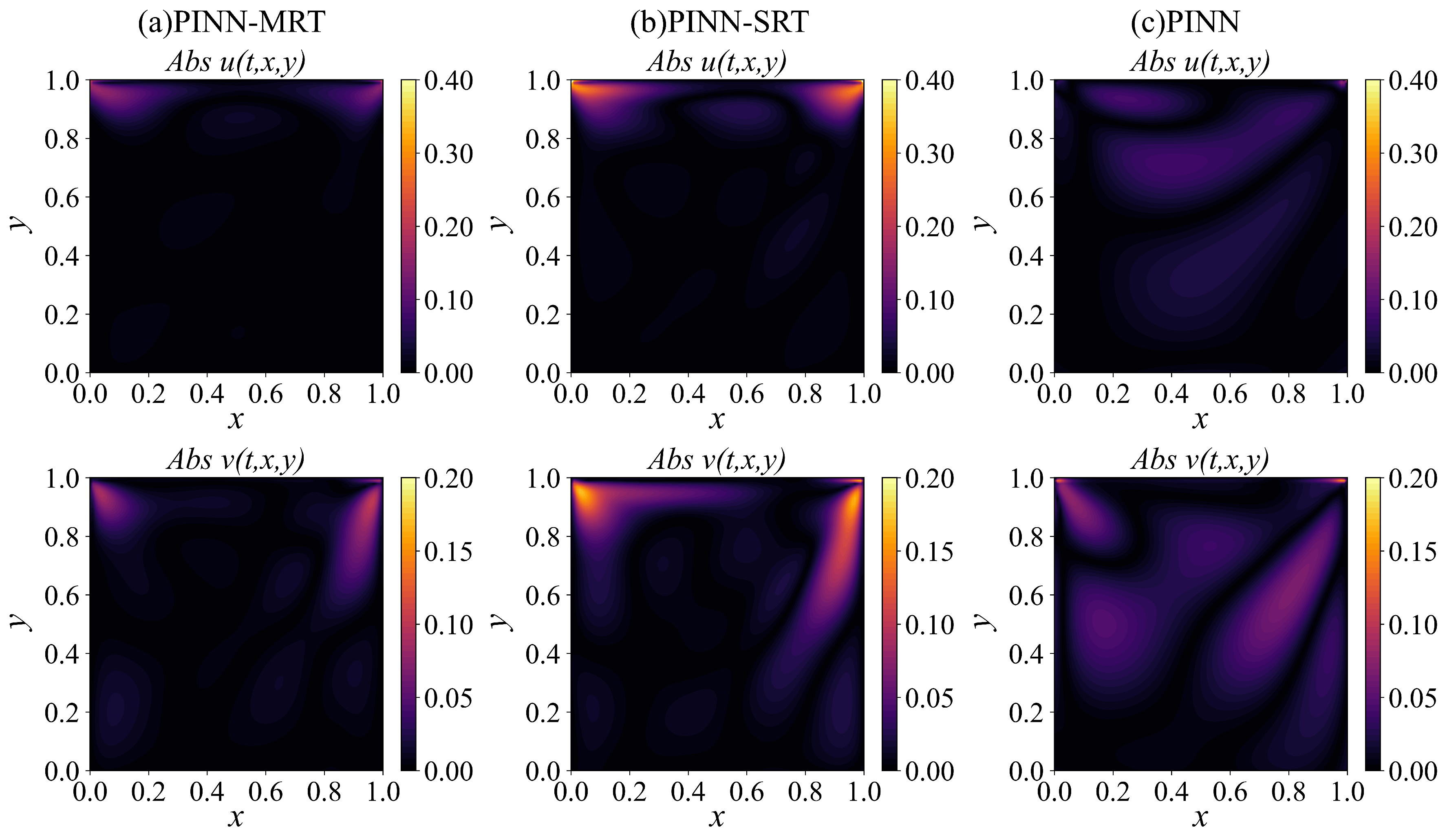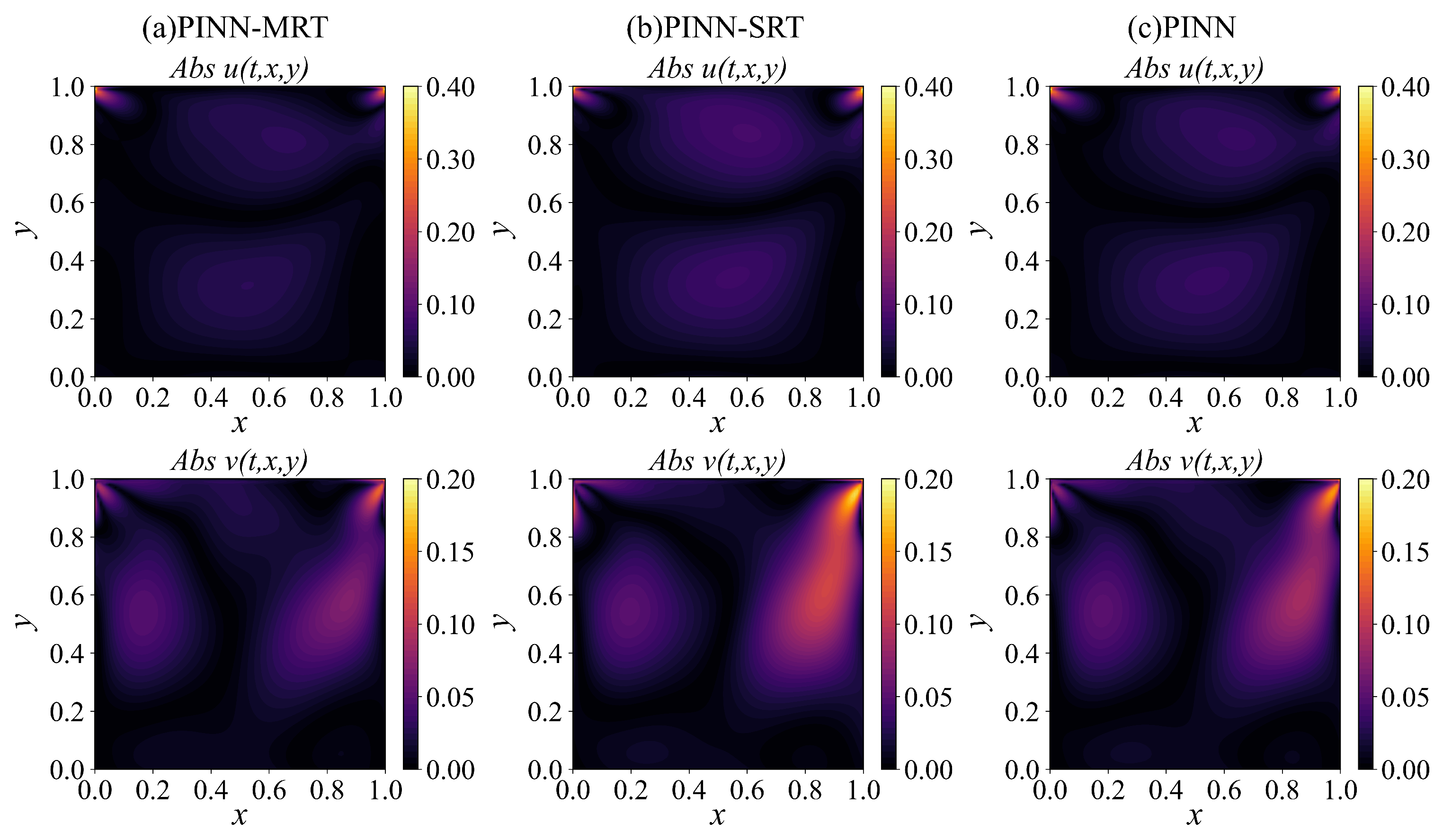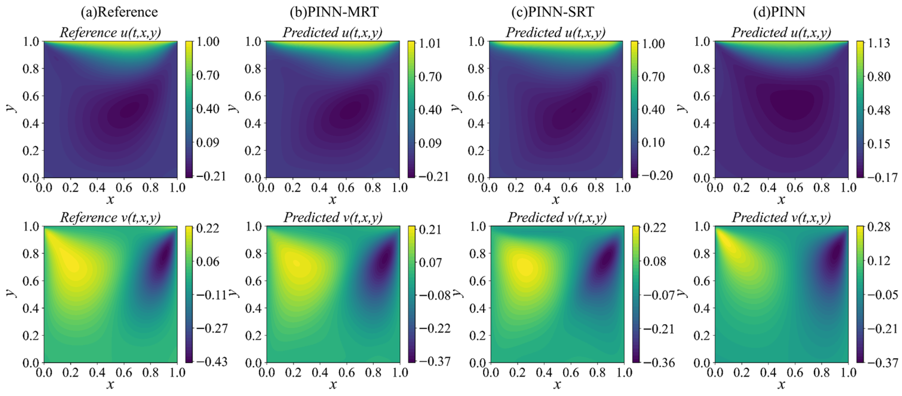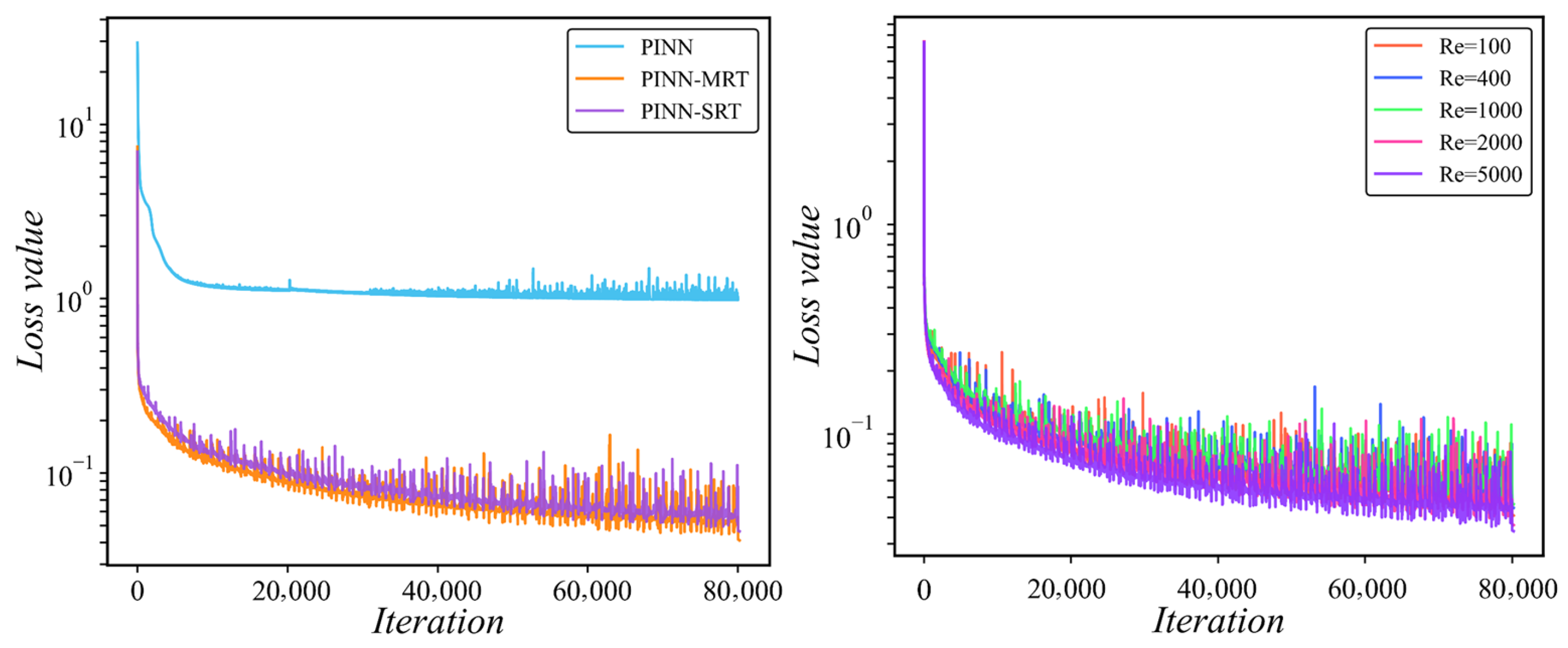 Despite the demonstrated advantages, several limitations of the present study should be acknowledged. First, the proposed PINN-MRT framework incurs a relatively high computational cost due to the dual-network structure and the additional mesoscopic constraints, and its scalability to large-scale or real-time simulations has not yet been systematically assessed. Second, a formal analysis of error propagation from the MRT relaxation parameters to the macroscopic PINN outputs remains to be developed, which would provide deeper insights into the sensitivity and robustness of the coupled learning process. Third, the current validation is limited to two-dimensional, single-phase steady flows, and the extension to three-dimensional or multiphase configurations requires further investigation. Finally, the present work employs fixed weighting coefficients in the composite loss function; introducing adaptive weighting schemes could further improve convergence efficiency and balance among competing physical constraints. Addressing these aspects constitutes an important direction for future research toward a more general, efficient, and physically consistent PINN-MRT framework.