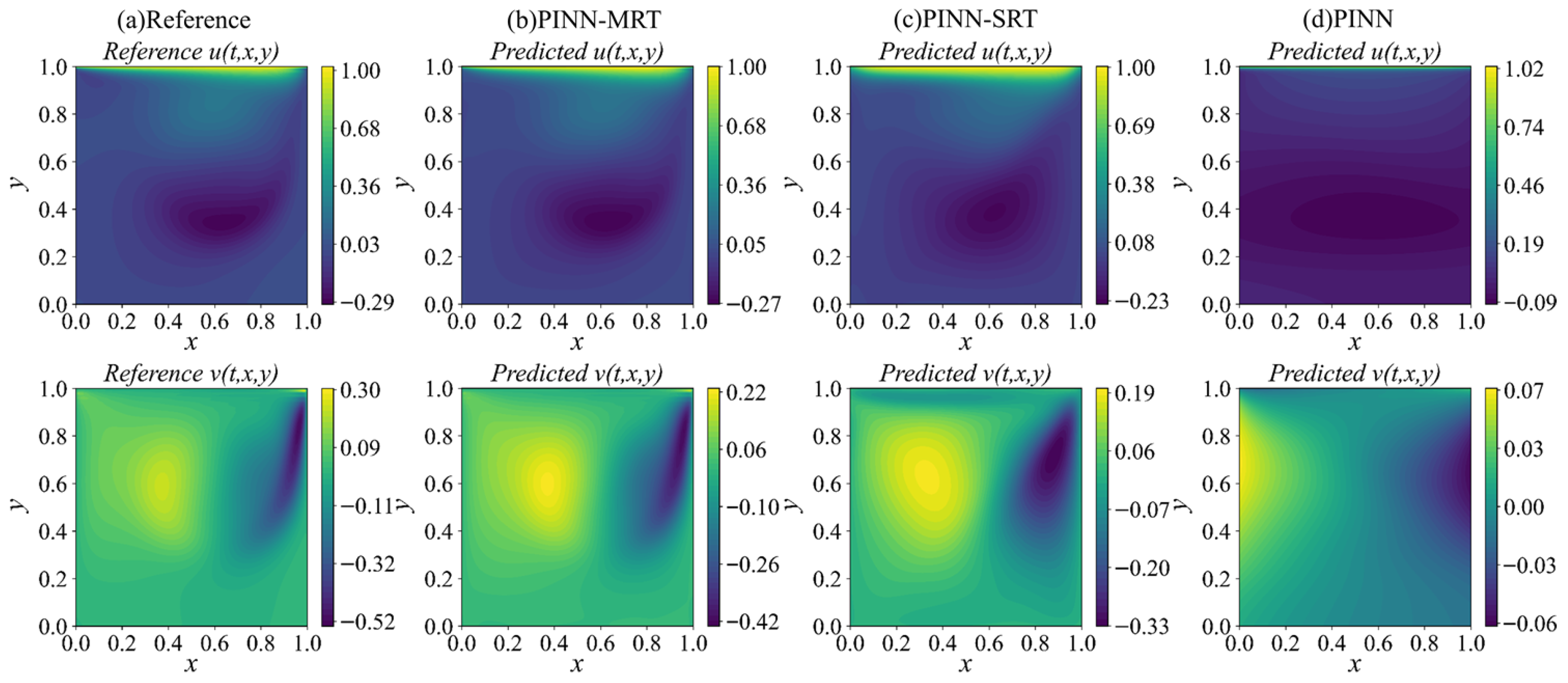 19]. Lou et al., for instance, implemented a single-relaxation-time (SRT) Bhatnagar–Gross–Krook (BGK) model within a PINN framework and demonstrated its feasibility for both forward and inverse flow reconstruction [