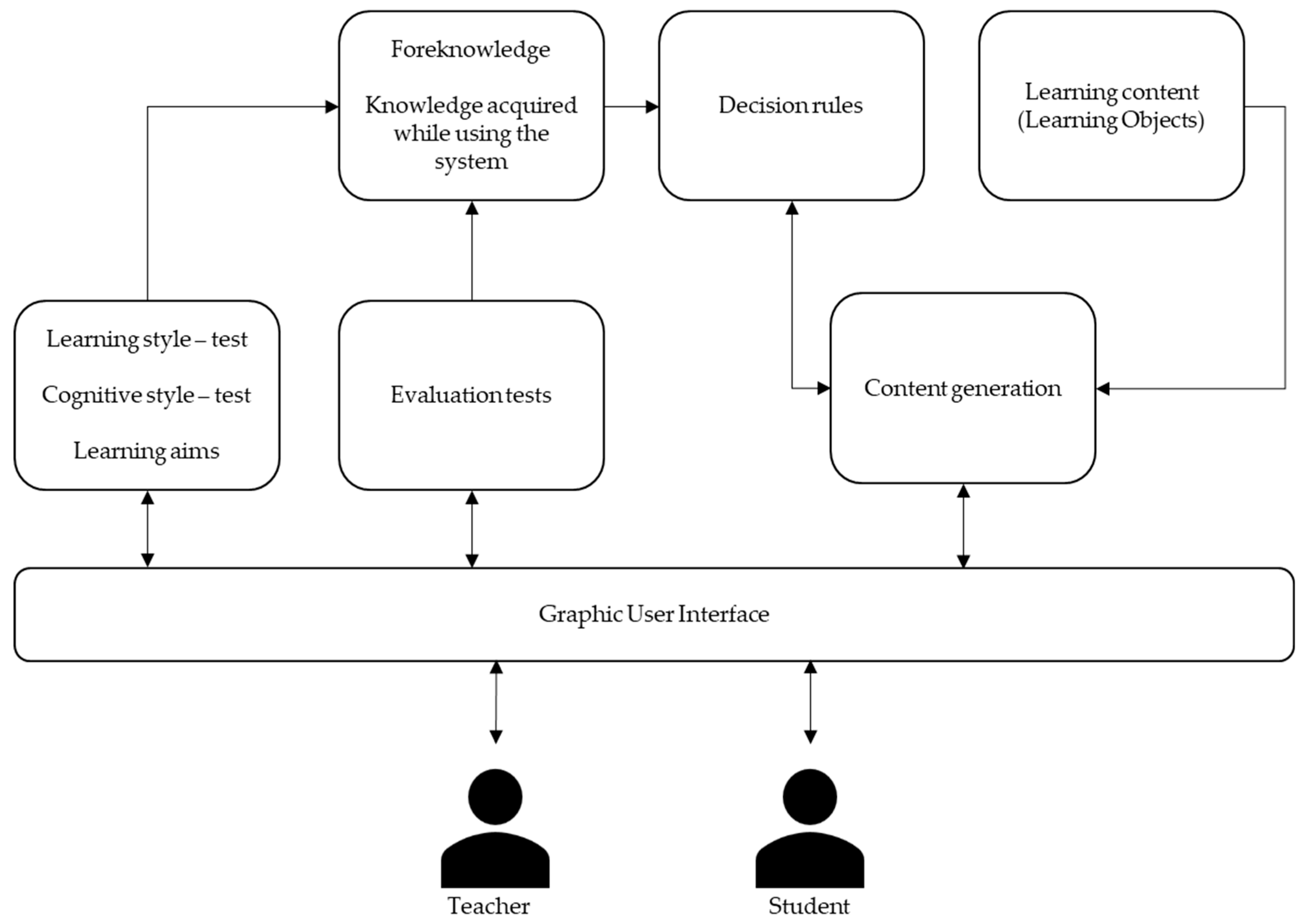 - Initial Student Module. This module handles the creation of a student profile, including results from tests that determine cognitive style and learning style. Both tests rely on validated questionnaires: the (visual, auditory, kinesthetic) Learning Styles Questionnaire by Chislett and Chapman, and the Study Process Questionnaire for cognitive style (approach to learning) by Biggs [44,45]. The reliability of the instruments was tested by calculating Cronbach’s alpha coefficient for both questionnaires. For the VAK instrument it is 0.929 and for the cognitive style instrument it is 0.612. Both values indicate satisfactory internal consistency and reliability of the instruments. Students complete these tests upon their first entry into the system.