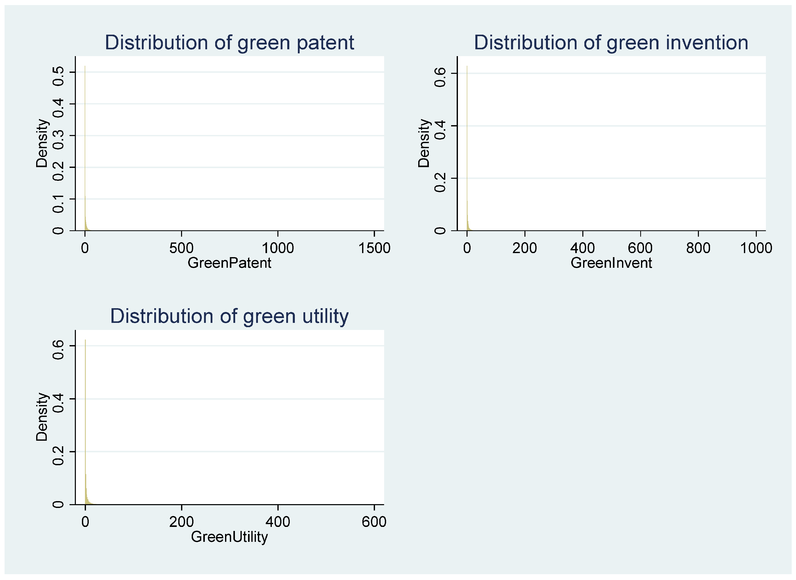 Table 2 shows the descriptive statistics. The summary shows that the green patent application average at 7.374, while the max value and standard deviation are 1485 and 38.258, respectively. This indicates considerable differences in green innovation among firms. The mean of institutional ownership is 0.432, with a paramount of 0.938 and a standard deviation of 0.253, implying differences in institutional ownership level among Chinese listed companies. In addition, the proportion of zero observations is 52% for GreenPatent, 62.9% for GreenInvent, and 62.4% for GreenUtility.