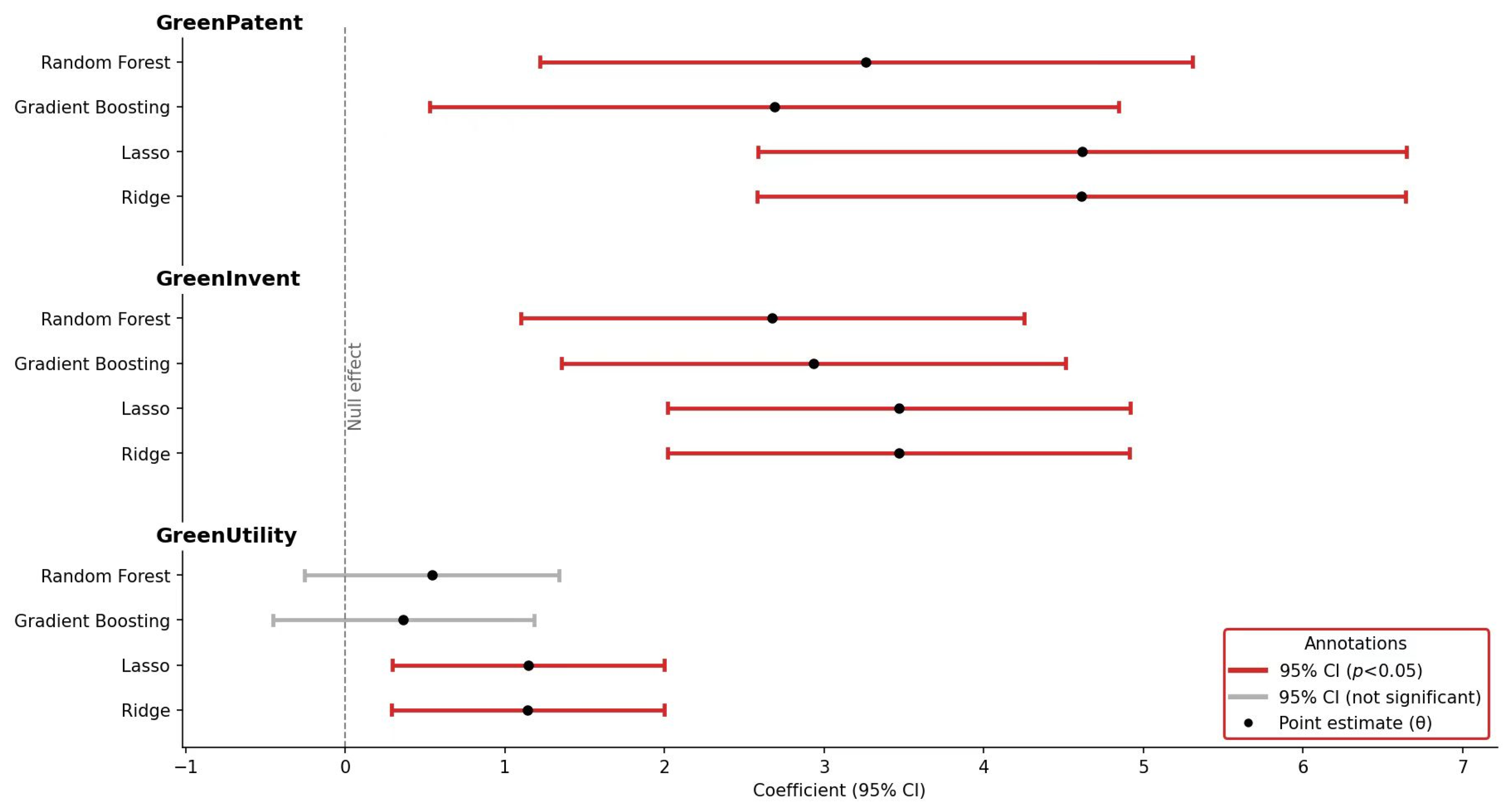 It is important to note that the purpose of employing multiple machine learning algorithms is not to select a single “best” model, but rather to demonstrate the robustness of our core finding. The slight variations in the coefficient magnitudes across models reflect the different ways each algorithm approximates the underlying nuisance functions; for instance, tree-based models excel at capturing non-linear interactions, while regularized linear models are efficient in high-dimensional settings with potentially sparse signals. The consistent direction and statistical significance of the InstInvest coefficient across all four distinct learners strongly suggest that the positive causal relationship with green innovation is a robust feature of the data, not an artifact of a particular model specification.