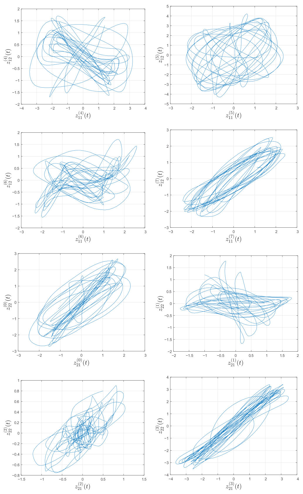 Remark 2. The preassigned time is a user-specified parameter that sets the desired synchronization time. Typically, the selected should satisfy . However, choosing an excessively short will raise the control gain through the term in the controller (6), increasing control energy consumption and implementation costs. This may result in violations of practical constraints, such as actuator saturation or energy limitations. Hence, the selection of should strike a balance between synchronization speed and feasible control inputs, ensuring that remains within acceptable system limits.