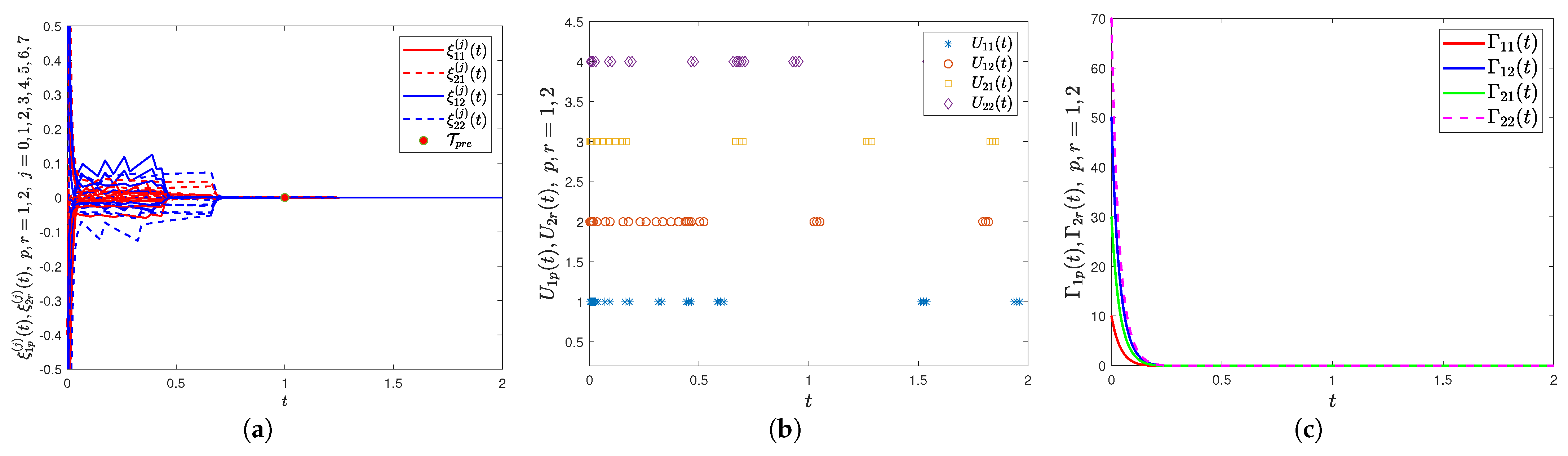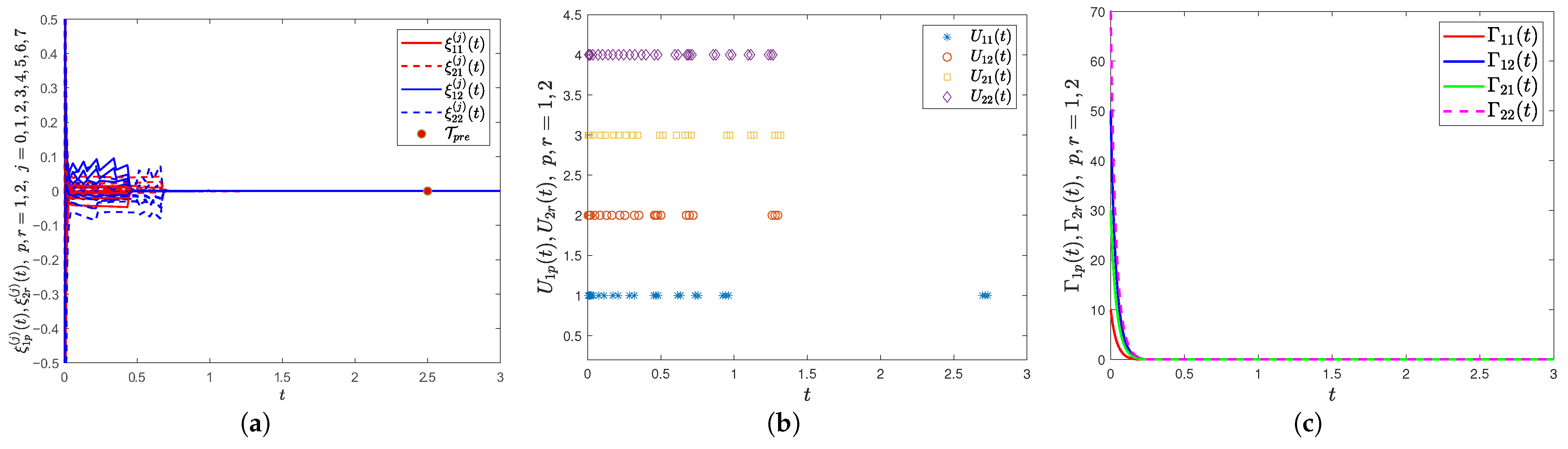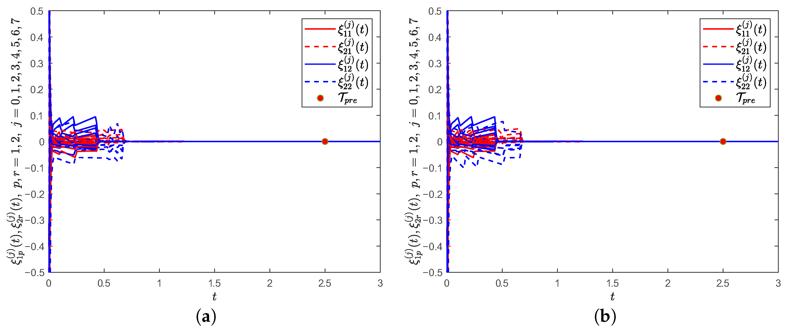 Corollary 6. Under Assumptions 1–3, the quantized control protocol (46) and the dynamic ETC mechanism (47)–(49), if , systems (1) and (2) can implement FDT projective lag synchronization, and the ST is assessed by , where is given in (46). Corollary 7. By adopting the quantized controller (46) with the dynamic ETC mechanism (47)–(49), the Zeno behavior can be excluded. Remark 6. Under the framework of the non-decomposition method, Theorems 1 and 4 establish the PDT projective lag synchronization of OV-BAMNNs using the 1-norm and 2-norm, respectively. In particular, Theorem 1 is derived by designing an exponential quantized ETC protocol under the 1-norm, while Theorem 4 is obtained using the 2-norm. It is noteworthy that two distinct Lyapunov functions are formulated in the theoretical analysis to demonstrate synchronization under the two respective norms. Moreover, compared with conventional decomposition-based methods [5,10,11] or the previous studies limited to a single norm [7,18], the proposed approach not only yields more comprehensive theoretical results but also significantly reduces computational redundancy. Remark 7. The proposed PDT projective lag synchronization scheme offers a unified framework that generalizes several conventional synchronization types. As defined by the error and , our results encompass: (i) PDT complete synchronization when ; (ii) PDT lag synchronization when ; and (iii) PDT anti-synchronization when . While previous studies often focus on these special cases, they fail to address the combined challenges of PDT convergence [7,8], projective scaling [15], and transmission delays [38] simultaneously. Hence, the findings of the paper are more generalizable. Remark 8. In contrast to the finite-time and FDT synchronization, the ST of PDT synchronization can be predetermined depending on actual demands. Under the identical criteria, the ST of the PDT synchronization is noticeably less than that of the FDT synchronization. From this viewpoint, the PDT synchronization results in this paper are greater flexibility and practicality compared to the approaches in [28,29,30]. Remark 9. This paper is compared with recent studies [24,25,27] to highlight its innovations. Unlike [25], which used quantized controllers for multi-layer networks, our study employs a more efficient quantized ETC scheme for OV-BAMNNs. Compared with [27], which achieved finite-time switching via intermittent control, this work solves the PDT projective lag synchronization problem, with a ST that can be preset independently of initial conditions. In contrast to [24], which developed PDT control for launch vehicles, our approach ensures PDT synchronization for NNs without requiring complex observers or performance functions. 4. Numerical Simulations