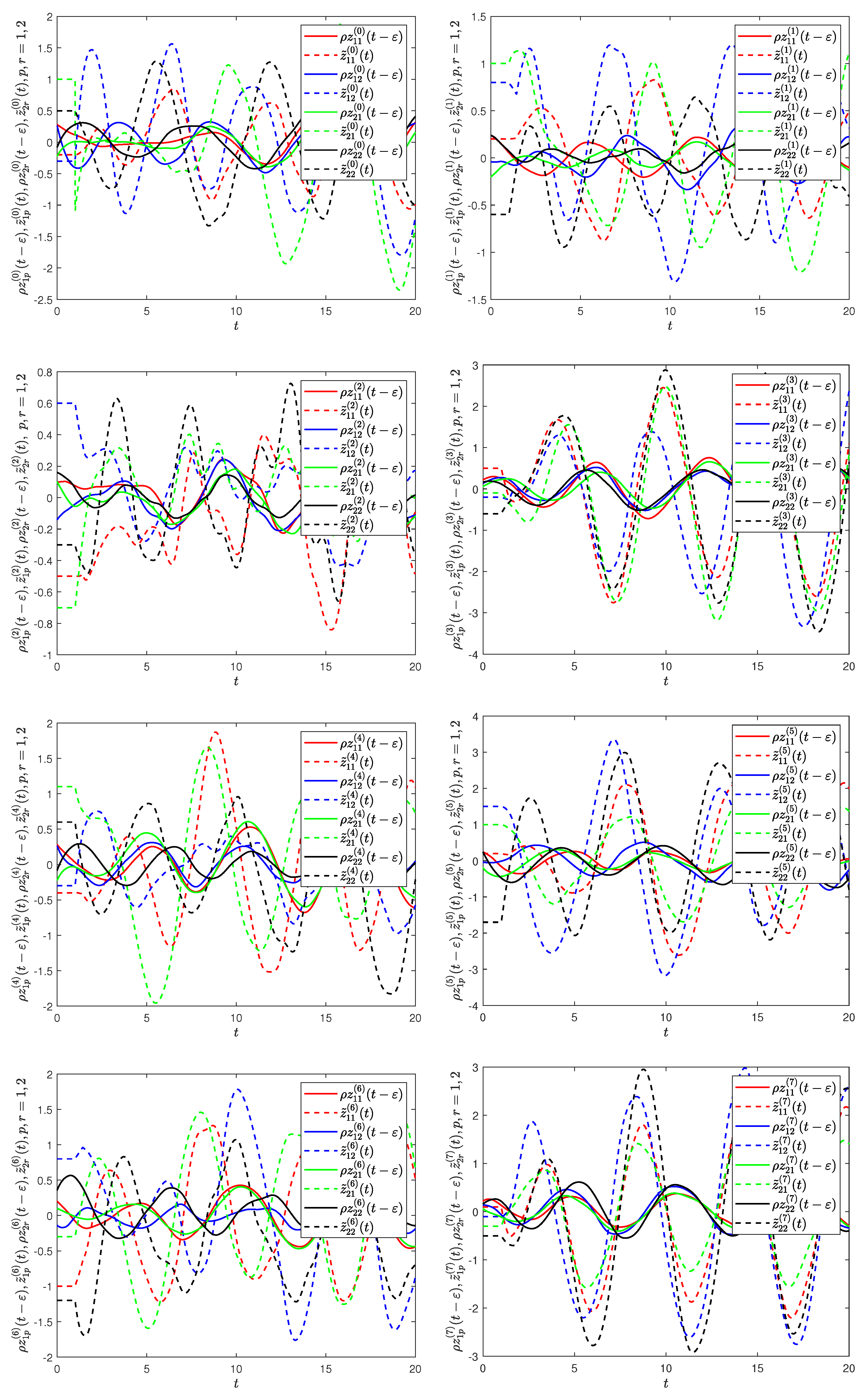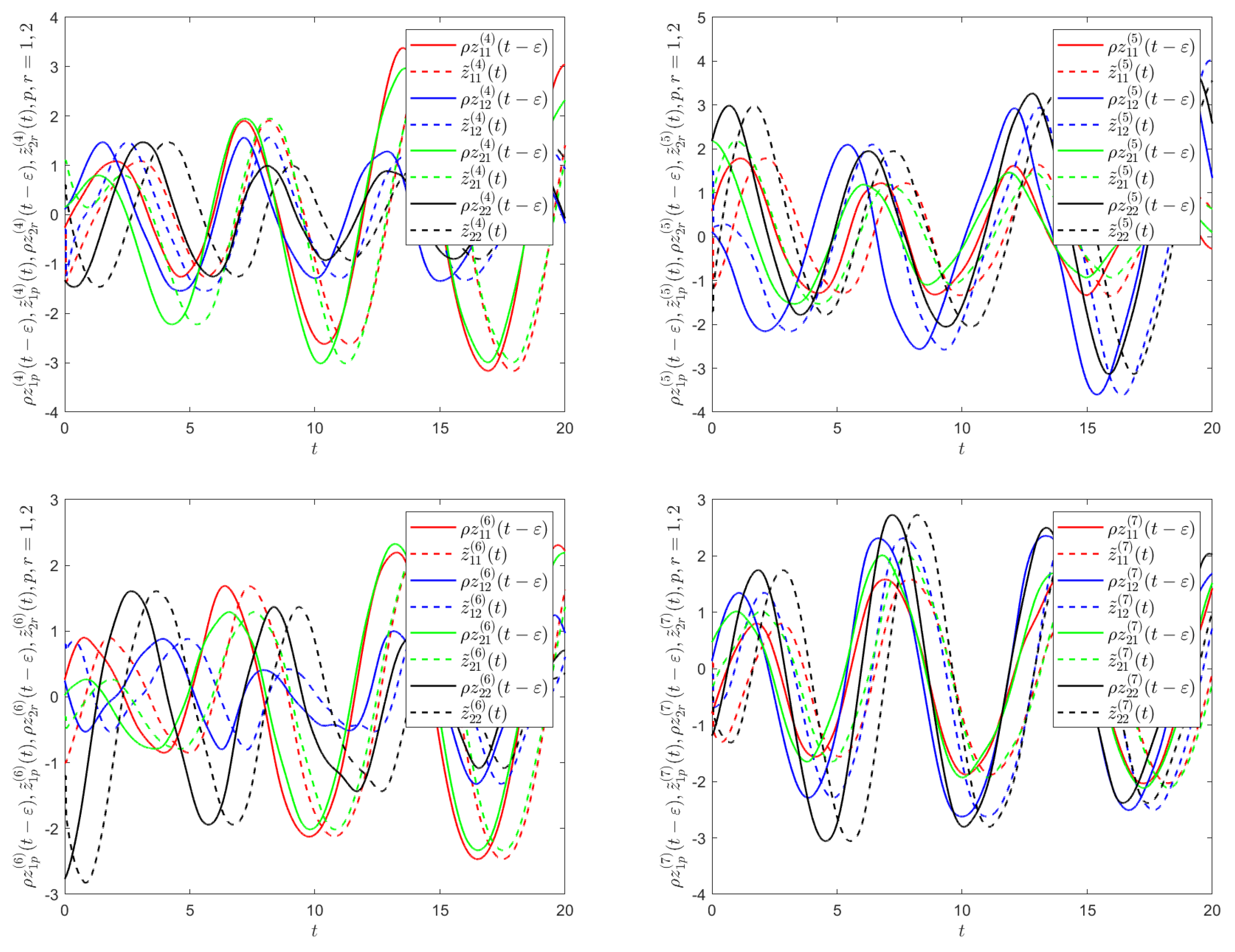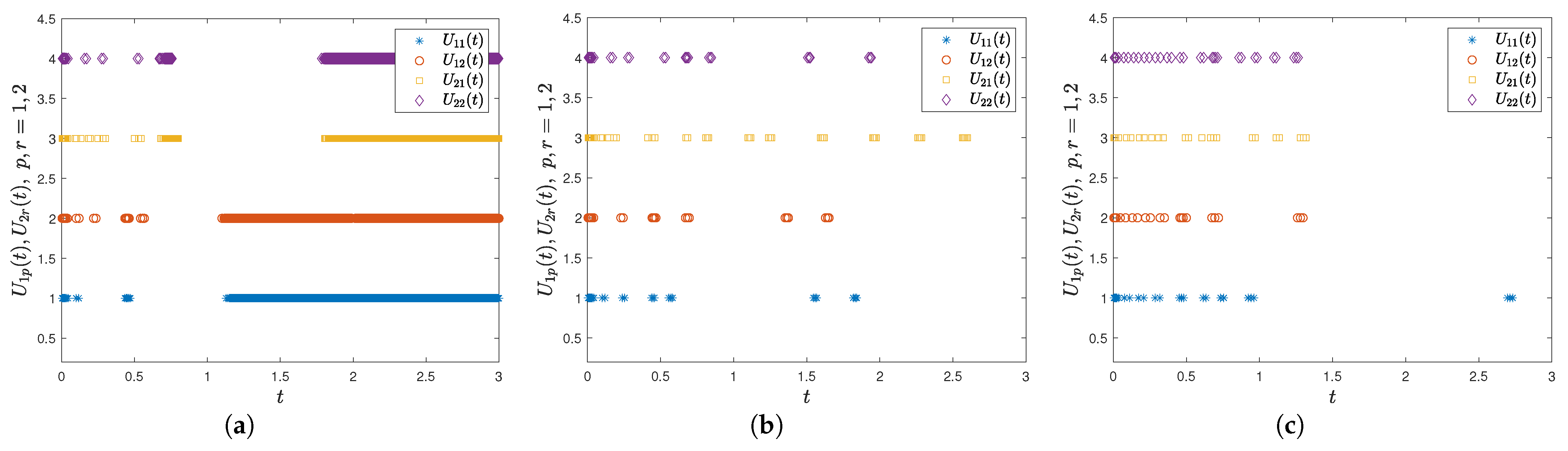 Corollary 6. Under Assumptions 1–3, the quantized control protocol (46) and the dynamic ETC mechanism (47)–(49), if , systems (1) and (2) can implement FDT projective lag synchronization, and the ST is assessed by , where is given in (46). Corollary 7. By adopting the quantized controller (46) with the dynamic ETC mechanism (47)–(49), the Zeno behavior can be excluded. Remark 6. Under the framework of the non-decomposition method, Theorems 1 and 4 establish the PDT projective lag synchronization of OV-BAMNNs using the 1-norm and 2-norm, respectively. In particular, Theorem 1 is derived by designing an exponential quantized ETC protocol under the 1-norm, while Theorem 4 is obtained using the 2-norm. It is noteworthy that two distinct Lyapunov functions are formulated in the theoretical analysis to demonstrate synchronization under the two respective norms. Moreover, compared with conventional decomposition-based methods [5,10,11] or the previous studies limited to a single norm [7,18], the proposed approach not only yields more comprehensive theoretical results but also significantly reduces computational redundancy. Remark 7. The proposed PDT projective lag synchronization scheme offers a unified framework that generalizes several conventional synchronization types. As defined by the error and , our results encompass: (i) PDT complete synchronization when ; (ii) PDT lag synchronization when ; and (iii) PDT anti-synchronization when . While previous studies often focus on these special cases, they fail to address the combined challenges of PDT convergence [7,8], projective scaling [15], and transmission delays [38] simultaneously. Hence, the findings of the paper are more generalizable. Remark 8. In contrast to the finite-time and FDT synchronization, the ST of PDT synchronization can be predetermined depending on actual demands. Under the identical criteria, the ST of the PDT synchronization is noticeably less than that of the FDT synchronization. From this viewpoint, the PDT synchronization results in this paper are greater flexibility and practicality compared to the approaches in [28,29,30]. Remark 9. This paper is compared with recent studies [24,25,27] to highlight its innovations. Unlike [25], which used quantized controllers for multi-layer networks, our study employs a more efficient quantized ETC scheme for OV-BAMNNs. Compared with [27], which achieved finite-time switching via intermittent control, this work solves the PDT projective lag synchronization problem, with a ST that can be preset independently of initial conditions. In contrast to [24], which developed PDT control for launch vehicles, our approach ensures PDT synchronization for NNs without requiring complex observers or performance functions. 4. Numerical Simulations