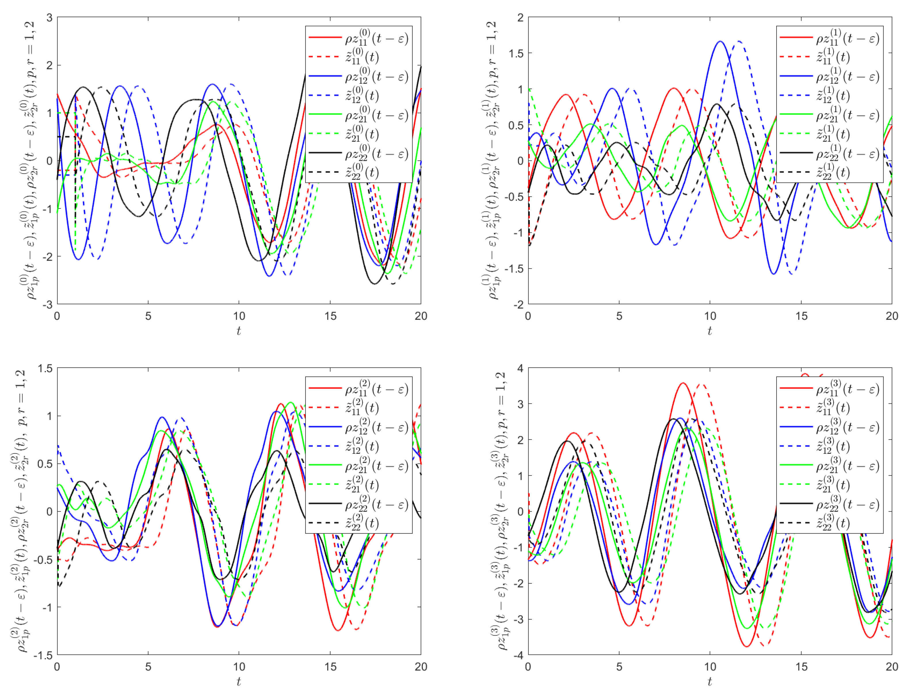 Corollary 2. Under Assumptions 1–3, the quantized control strategy (29) and the dynamic ETC mechanism (30)–(32), if and , the OV-BAMNNs (1) and (2) can achieve FDT projective lag synchronization, and the ST is reckoned as , where is given in (29). Corollary 3. By adopting the quantized controller (29) with the dynamic ETC mechanism (30)–(32), the Zeno behavior can be excluded. To further strengthen the practicability of the results in this article, the PDT projective lag synchronization of OV-BAMNNs will be investigated by employing the 2-norm.