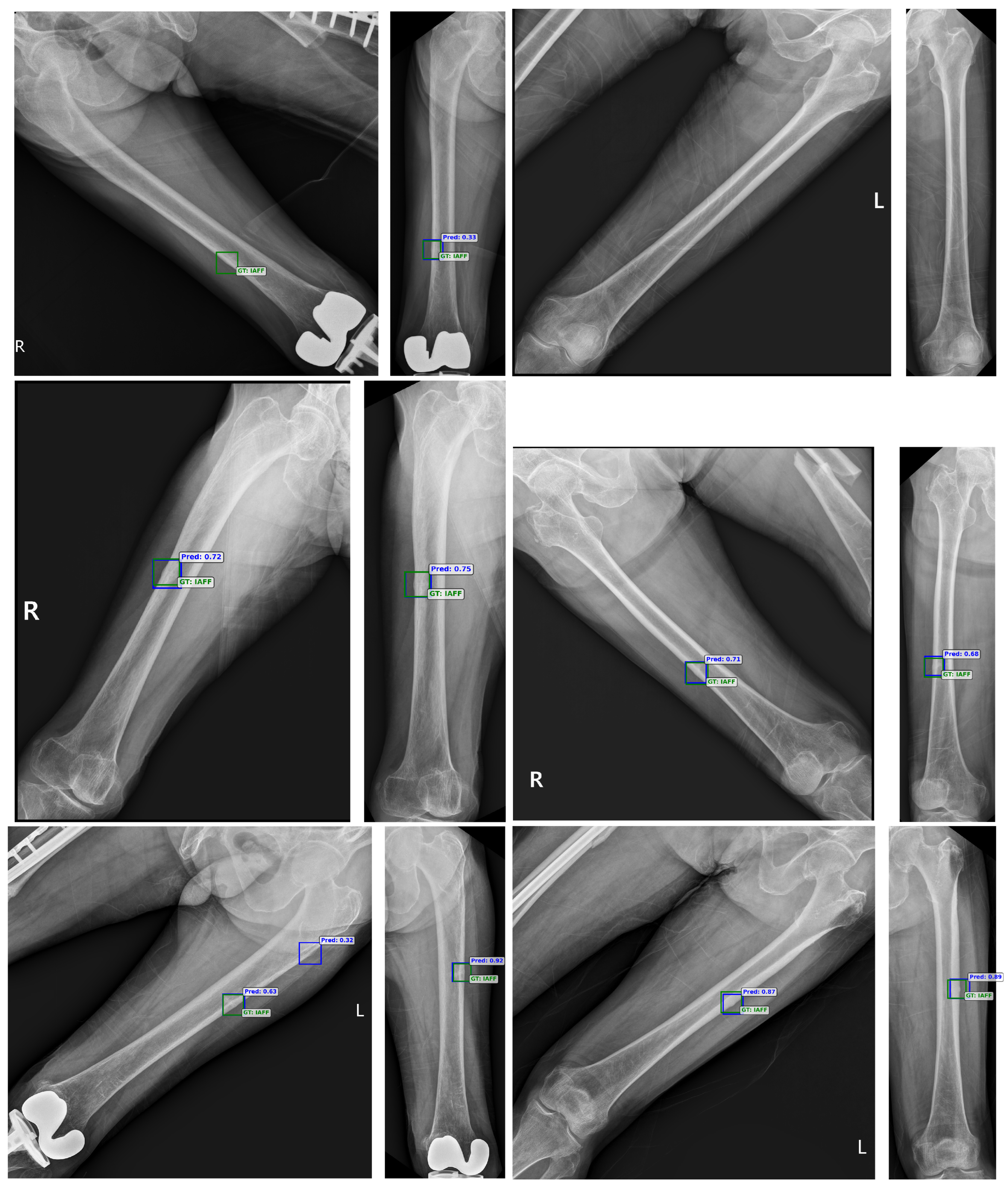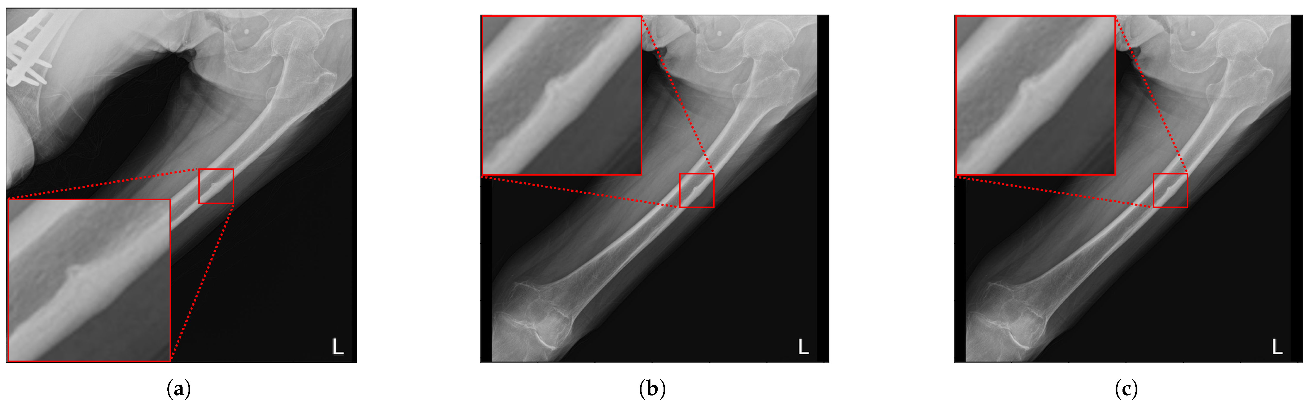 - Yıldız Potter, İ.; Yeritsyan, D.; Mahar, S.; Kheir, N.; Vaziri, A.; Putman, M.; Rodriguez, E.K.; Wu, J.; Nazarian, A.; Vaziri, A. Proximal femur fracture detection on plain radiography via feature pyramid networks. Sci. Rep. 2024, 14, 12046. [Google Scholar] [CrossRef]