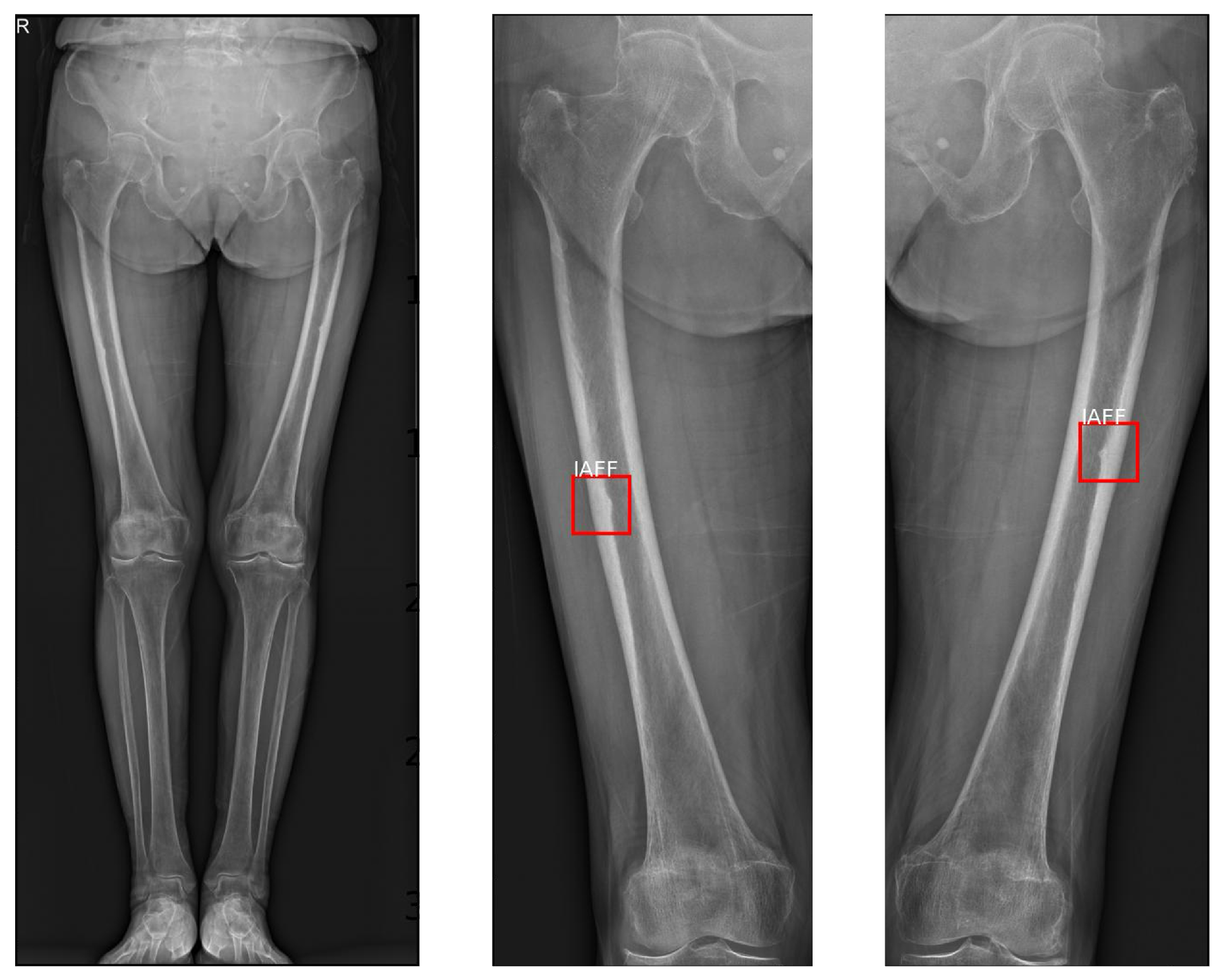 - Nguyen, H.H.; Le, D.T.; Shore-Lorenti, C.; Chen, C.; Schilcher, J.; Eklund, A.; Zebaze, R.; Milat, F.; Sztal-Mazer, S.; Girgis, C.M.; et al. AFFnet-a deep convolutional neural network for the detection of atypical femur fractures from anteriorposterior radiographs. Bone 2024, 187, 117215. [Google Scholar] [CrossRef]