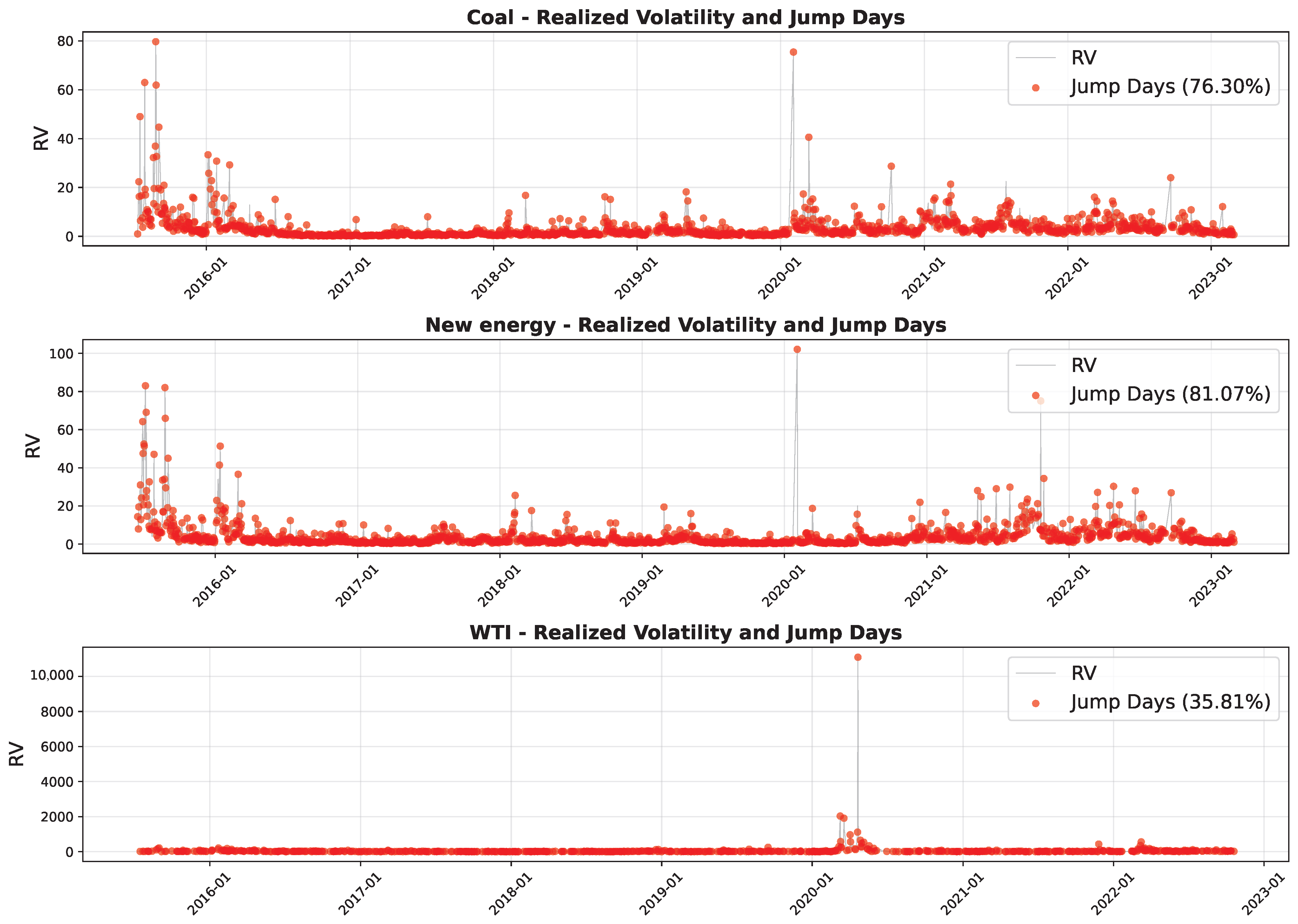 - Coal index jump dynamics: In the high-volatility state, the jump coefficient exhibits weaker significance (10% level). In the low-volatility state, the medium-term jump coefficient becomes significant at the 1% level. However, the model’s in-sample fit shows no substantial difference between the two jump specifications. Unlike the new energy index, decomposing coal index volatility into high and low regimes does not yield additional explanatory power for jump dynamics.