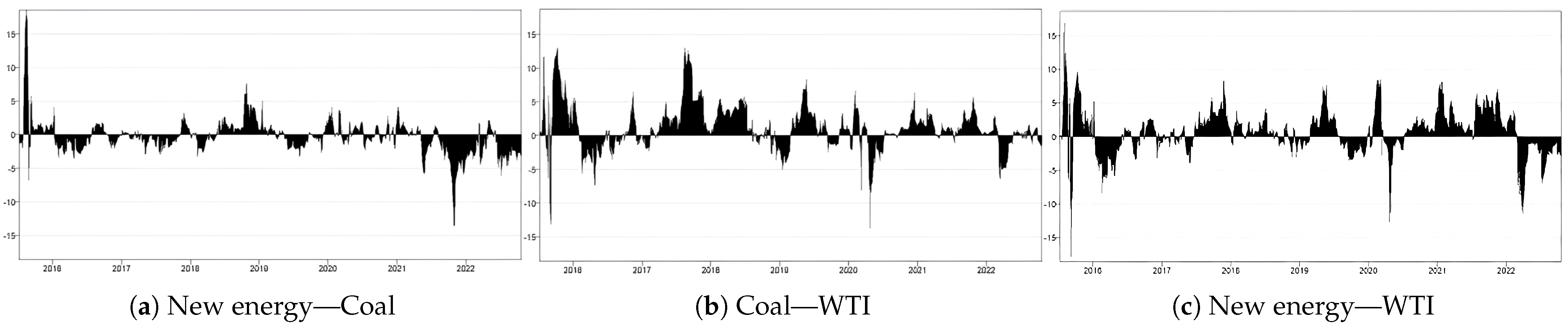 - New energy index jump dynamics: In the high-volatility state (), the short- and medium-term jump coefficient is statistically significant. In the low-volatility state (), the long-term jump coefficient is significant at the 1% level. This pattern suggests that jumps in low-volatility periods enhance long-memory properties, while high-volatility periods emphasize short- and medium-term dynamics.