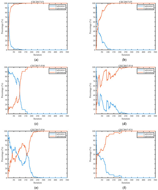 Figure 5 presents the dynamic evolution of exploration and exploitation for the MESDO algorithm on representative functions (F1, F5, F16, F2, F26, F30) from the CEC2017 benchmark suite (dimension ). The exploration rate and exploitation rate are calculated using Equations (17) and (18), respectively, measured by the ratio of the diversity metric (defined in Equation (19), reflecting the dispersion of each dimension in the population relative to the median) to the maximum diversity .