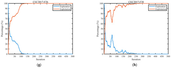 Optimization algorithms operate through two complementary search paradigms: exploration, which entails a widespread investigation of the solution space to identify regions of potential, and exploitation, which involves a concentrated effort to hone high-quality solutions [49,50]. A bias towards the former can lead to inefficient, unproductive search; a dominance of the latter often traps the algorithm in local optima. Consequently, the strategic equilibrium between them is a decisive factor for success. The subsequent analysis evaluates this balance within the MESDO framework, applying the metrics defined in Equations (17) and (18) [48,50].