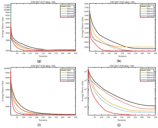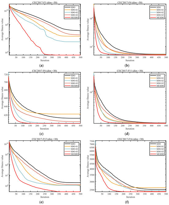 A methodical ablation framework was established to dissect the individual efficacy and synergistic interactions of the three core innovations: the Elite-guided search strategy (S1), Adaptive differential evolution operator strategy (S2), and Centroid-based opposition learning boundary control strategy (S3). Utilizing the CEC2017 benchmark (d = 30), we evaluated five algorithmic variants: the standard SDO, three partial implementations (SDO-S1, SDO-S2, SDO-S3), and the complete MESDO. This design allows for clear efficacy attribution, with the comparative results detailed in Figure 6 and Figure 7.