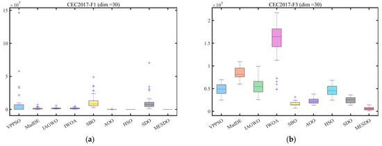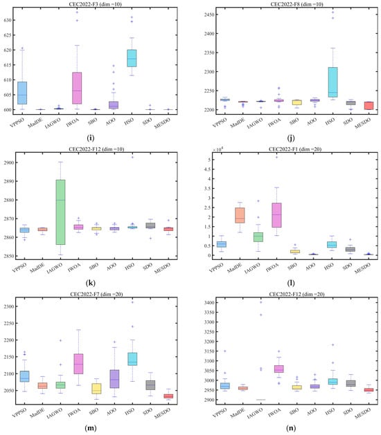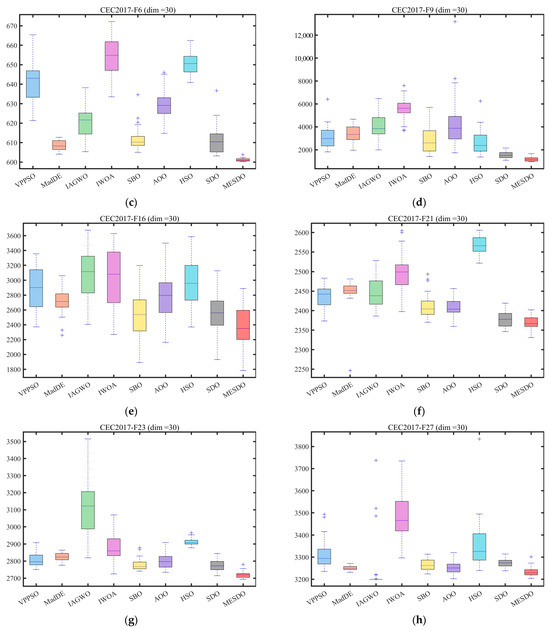 The convergence curves in Figure 6 indicate that while each of the three strategies enhances performance differently, their combination produces a significant synergistic effect. For unimodal functions, SDO-S1 (integrating S1) accelerates convergence by guiding the search direction with elite solutions, entering high-quality regions earlier than the original SDO. SDO-S2 (integrating S2), leveraging mutation operations guided by the global best solution, demonstrates stronger global exploration in the early iterations, quickly covering critical areas of the solution space. SDO-S3 (integrating S3), through boundary control, reduces ineffective searches, resulting in significantly more stable convergence in the later iterations compared with the original SDO, avoiding performance fluctuations caused by random resets of out-of-bounds solutions. The complete MESDO algorithm, benefiting from the synergy of the three strategies, shows a convergence curve with no noticeable oscillations and consistently outperforms all comparison algorithms, achieving optimization accuracy far superior to both the original SDO and single-strategy variants. This demonstrates the efficient coordination of “global exploration—local exploitation—stable convergence”.