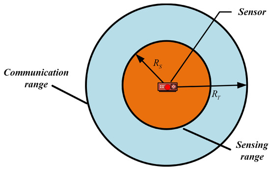The perception model of the sensor is shown in Figure 11, where the sensing region and communication range are defined by two concentric circles. The sensing area is modeled as a disk with radius , while the communication radius is set to twice (i.e., ). According to existing studies [49,52], when the communication range is at least twice the sensing range, the network can ensure full coverage of the convex area while maintaining connectivity among all active nodes. However, this model is based on the assumption of omnidirectional sensing and is not applicable to devices with directional sensing capabilities, such as cameras or ultrasonic sensors.