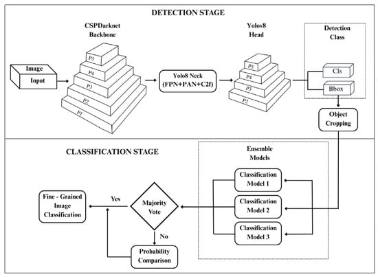 Classification stage: In the preceding stage, the YOLOv8m detector identifies the object and subsequently crops it. In this stage, an ensemble of classifier models is employed for object classification. After the object is classified by each of the classifiers in the ensemble, a vote strategy is performed to determine which model is the best. The winning model is responsible for assigning the subclass label to the object. This process enables the implementation of a fine-grained classification object. This strategy utilizes the implementation of an ensemble of classifier models to leverage the distinctive characteristics inherent in each classification model.