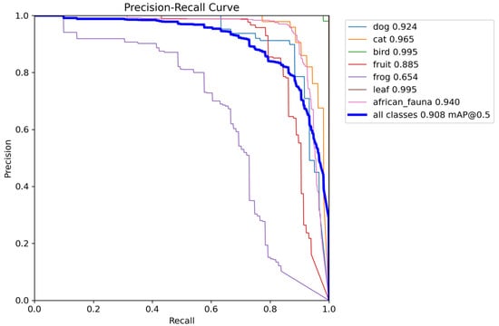 As illustrated in Figure 3, the precision–recall curve for the YOLOv8m detection model is presented. Each line in the figure represents the performance of a specific class, thereby allowing for the observation of the relationship between precision and recall (ability to detect all real objects). The “leaf” and “bird” classes demonstrate remarkable performance, attaining mAP50 values of 0.995. In contrast, the “frog” class exhibits substandard performance, with an mAP50 of 0.654. The thick blue curve signifies the mean average of the model across all classes, exhibiting an mAP of 0.5 of 0.908, thereby substantiating the model’s capacity to execute precise detection on the utilized dataset.