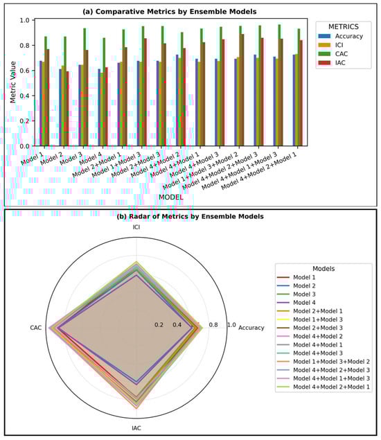 Figure 6 presents a comparison of the performance of EDICA with one model vs. several ensemble models using different classification metrics. Specifically, Figure 6a presents a bar chart that illustrates the performance of each model in terms of four key metrics: accuracy, ICI, CAC, and IAC. The findings indicate that the ensemble models demonstrate superior performance in terms of the accuracy and the confidence of their predictions when compared to the individual models. This suggests that the hybrid approach exhibits greater reliability and robustness. In addition, Figure 6b presents a radar chart that synthesizes these metrics into a single representation, thereby enabling a comprehensive comparison of the models’ performance. The graph illustrates that the ensemble models demonstrate a more balanced and uniform performance across all metrics. The ensemble model comprising three classifiers exhibits the highest values, while the individual models demonstrate lower results. In summary, the findings indicate that the ensemble models exhibit superior performance in comparison to the single models. This outcome supports the hypothesis that using ensemble models not only enhances the accuracy of the models but also reinforces the stability and reliability of the EDICA architecture in complex multi-class classification scenarios.