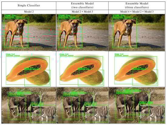 In Figure 7, a visual representation is finally presented, illustrating the performance of the ensemble model during the classification stage of the EDICA architecture. This representation is achieved through three different scenarios. The initial row corresponds to a rudimentary scenario, with a solitary object present in the image. The second row illustrates an intermediate case, in which there are two objects of the same subclass. The third row exemplifies a complex context wherein multiple objects with different subclasses coexist within a single image. In each case, the results obtained using only one classifier, Model 2 (YOLO11m), the ensemble model with two classifiers, Model 2 + Model 3, and the model with three classifiers, Model 4 + Model 2 + Model 3, are compared. It has been observed that, as the visual complexity of the data increases, implementing multiple classifiers can contribute to a reduction in labeling errors and an enhancement in consistency in object classification across different subclasses.