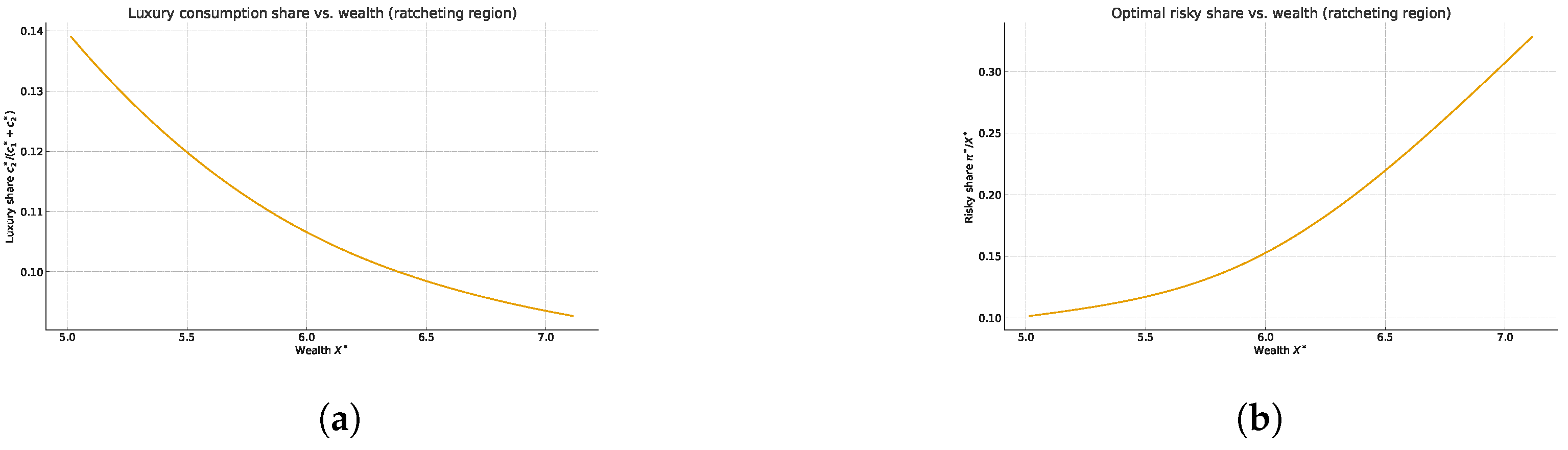 Part (3) demonstrates that the optimal risky share still increases with wealth, but the limiting behavior differs from the benchmark. At low wealth, the risky share approaches , identical to the benchmark, since the agent focuses on necessities. At high wealth, however, the limiting share rises to , which exceeds from the benchmark case. This means that the ratcheting constraint induces greater risk-taking than in the frictionless model: because luxury consumption cannot decline, the agent takes on more financial risk to sustain or raise her luxury level. The effective risk aversion thus falls below , producing stronger wealth–risk sensitivity.
