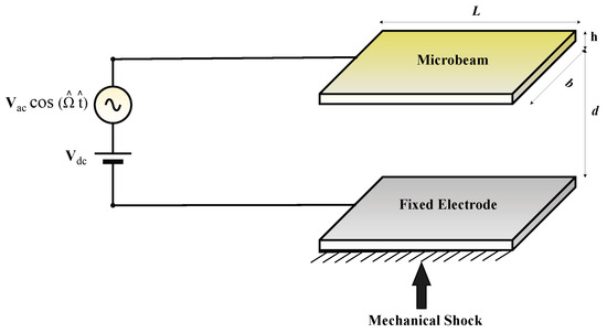 where is the vertical deflection at any position and time , is the area moment of inertia, is its density, b is its width, h is its thickness, is the axial load, L is the beam’s length, d is the gap distance between the electrodes, m is the beam’s mass per unit length, E is Young’s modulus, c is the viscous damping coefficient, is the dielectric constant, f is the shock acceleration and A is the cross sectional area of the beam. The physical parameters utilised in the present model are derived from [42] and are outlined as follows. The beam material possesses a Young’s modulus and a density . The geometric dimensions of the microbeam are specified as a length , width , and thickness . The gap between the beam and the electrode is specified as .