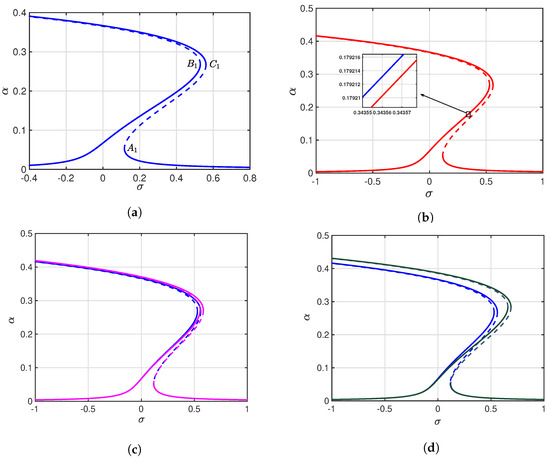 By substituting A and B into Equation (21), eliminating the secular terms, and assuming and , where and represent the amplitude and phase of the resonator’s temporal displacement , respectively, we obtain the following system by separating the real and imaginary parts.