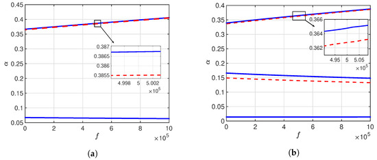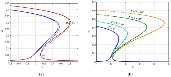 In Figure 6a, where , the amplitude increases to higher levels as shock acceleration increases, compared to Figure 5a,b. At the same time, the unstable portion continues throughout a wide range of f, along with only one stable branch. This unstable part indicates that the resonator dynamics are significantly affected by the unstable solutions of the corresponding values of f. Figure 6b shows the presence of three stable branches alongside two unstable ones. The bottom stable branch remains nearly invariant with rising f, whereas the top stable branch progressively increases with f.