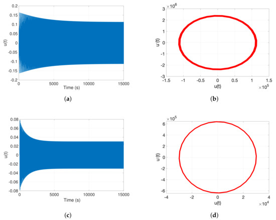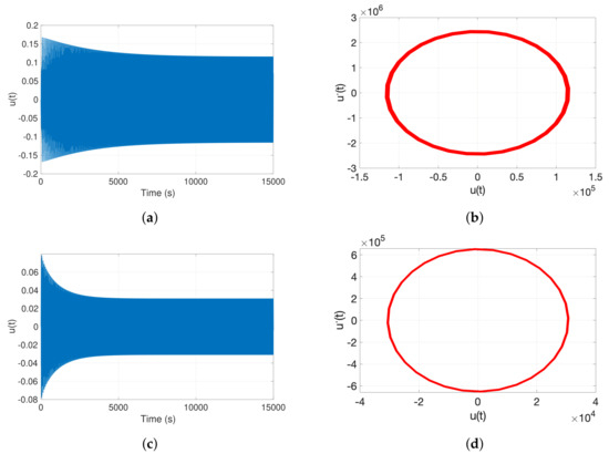 In contrast, Figure 11 examines a significantly larger shock acceleration of . For , the system exhibits a very large amplitude response (Figure 11a), characterized by a slow and complex transient regime with delayed convergence. The phase portrait (Figure 11b) shows a large, slightly distorted elliptical orbit, signaling strong nonlinear dynamics. Interestingly, a minor increase in to (Figure 11c,d) leads to a substantial suppression of oscillation amplitude and a highly compact, rapidly decaying response, both in the time domain and the phase plane. The comparison of Figure 10 and Figure 11 underscores a consistent trend: at elevated shock levels, the system remains highly sensitive to small perturbations in the detuning parameter. Nevertheless, the nonlinearities become more pronounced at higher shocks, as seen in the more distorted orbits and stronger oscillatory responses. These results indicate the role of fine-tuning in regulating the dynamic stability and energy dissipation of MEMS resonators under harsh shock environments.