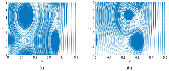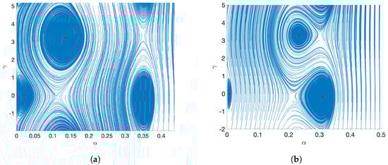 In Figure 12, which shows the scenario of no mechanical shock (), the system acts in a conventional nonlinear way, with steady-state responses and clear zones of attraction. The trajectories show how the system changes from different initial conditions to its steady-state response. As seen in Figure 12a,b, three distinct stable spiral points (small red ones) are present. Depending on initial conditions, low-amplitude, medium-amplitude and high- amplitude steady-state develop. In Figure 3a, at the detuning parameter value , the amplitude response exhibits three distinct equilibrium states corresponding to , , and . These three amplitude values represent stable fixed points of the system, as evidenced by their appearance as attractors (red points) in the phase plane portrait presented in Figure 12a. The phase plane analysis reveals that each of these equilibrium amplitudes is associated with its own basin of attraction, delineated by the concentric contour patterns surrounding each red point. Trajectories initiating within a particular basin will converge to the corresponding attractor, demonstrating the multistable nature of the system at this detuning value. The coexistence of these three stable equilibrium states explains the complex amplitude-frequency relationship observed in Figure 3a, where the system can settle into different oscillation amplitudes depending on the initial conditions. In Figure 12b, for , a notable deformation in the geometry of the state plane is shown which indicates response sensitivity to the detuning parameter .
