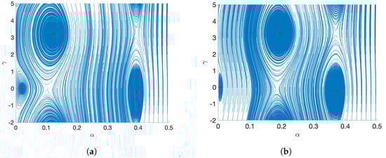 where are given in the Appendix A Equations (A7)–(A12). Considering the right-hand sides of Equations (24) and (25) as and , respectively, the local stability of the steady-state response is determined by computing the elements of the Jacobian matrix , which are the partial derivatives of the functions and as shown in the appendix Equation (A13). The eigenvalues of determine the stability regions. If the real parts of all eigenvalues are negative, the solution is stable. If any eigenvalue has a positive real part, the solution is unstable. The elements of Jacobian matrix are