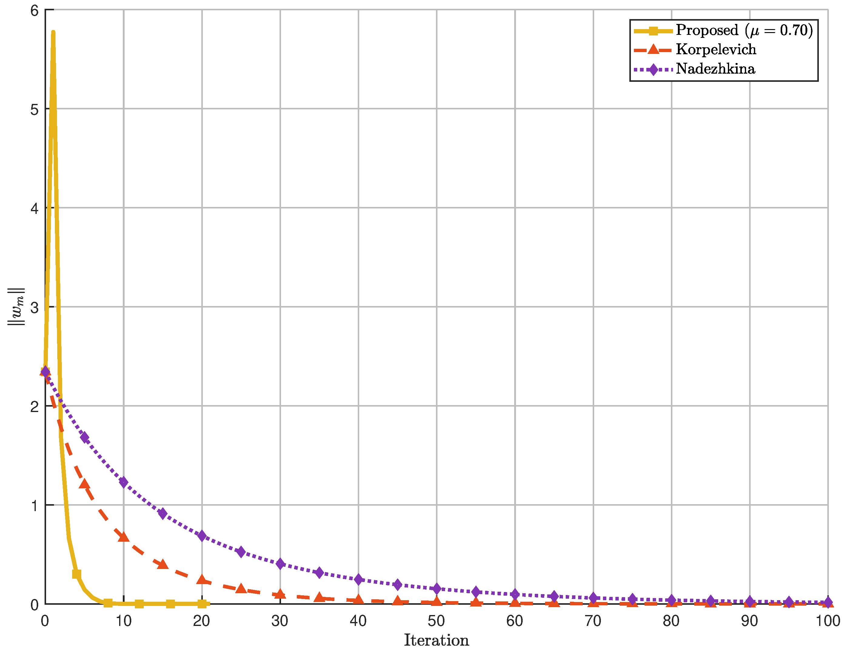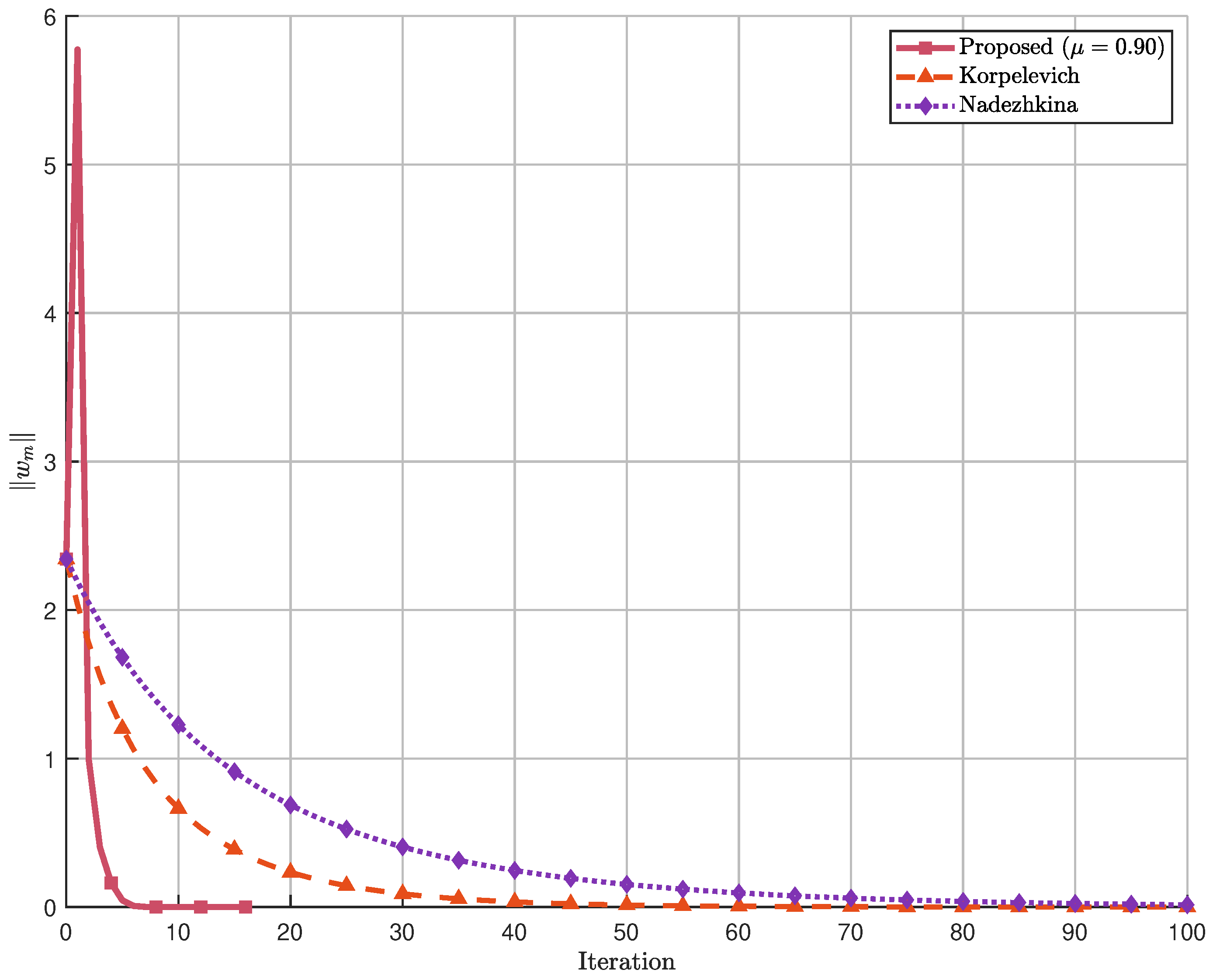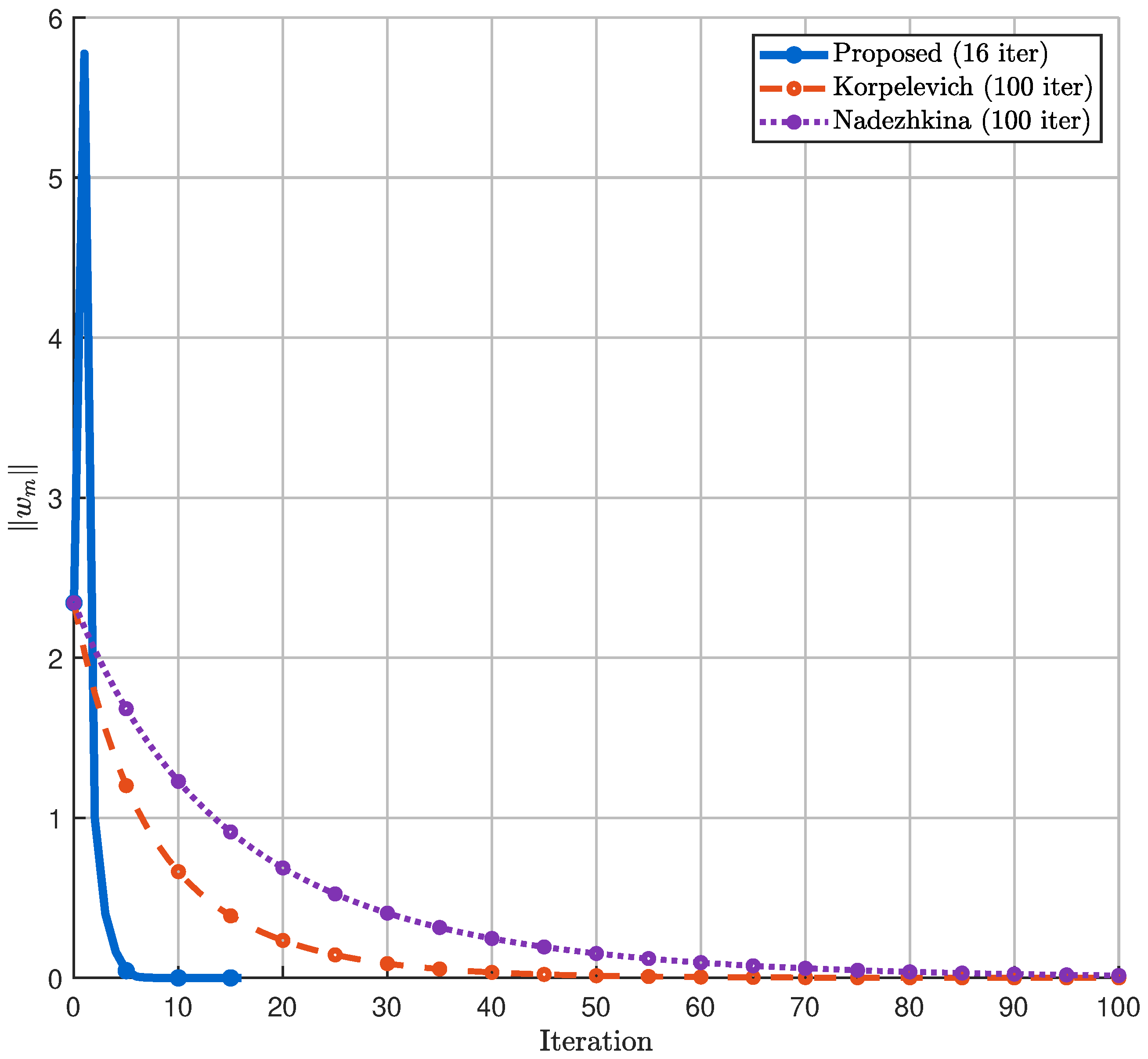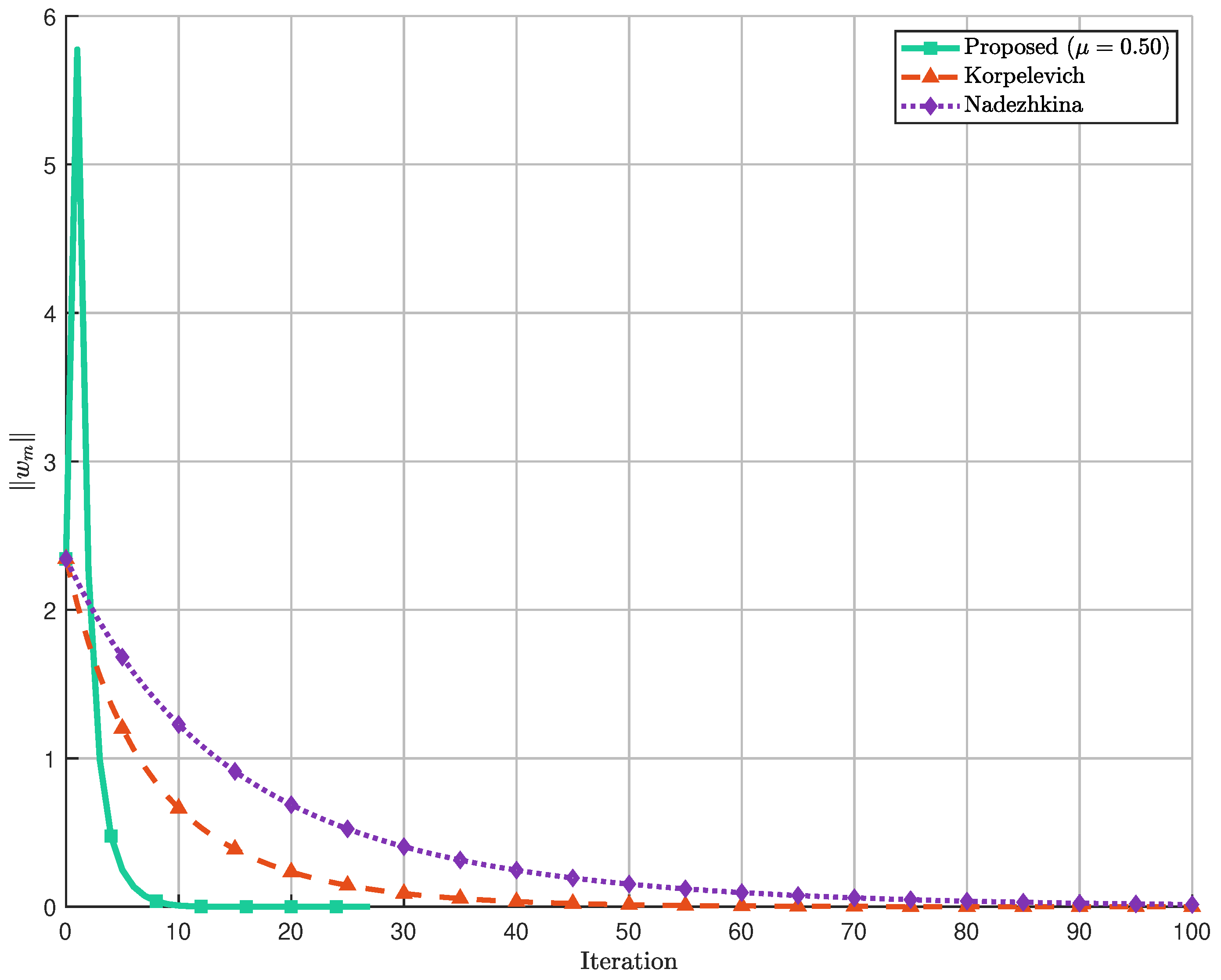 We compare the performance of three optimization algorithms: the proposed method and the Korpelevich [