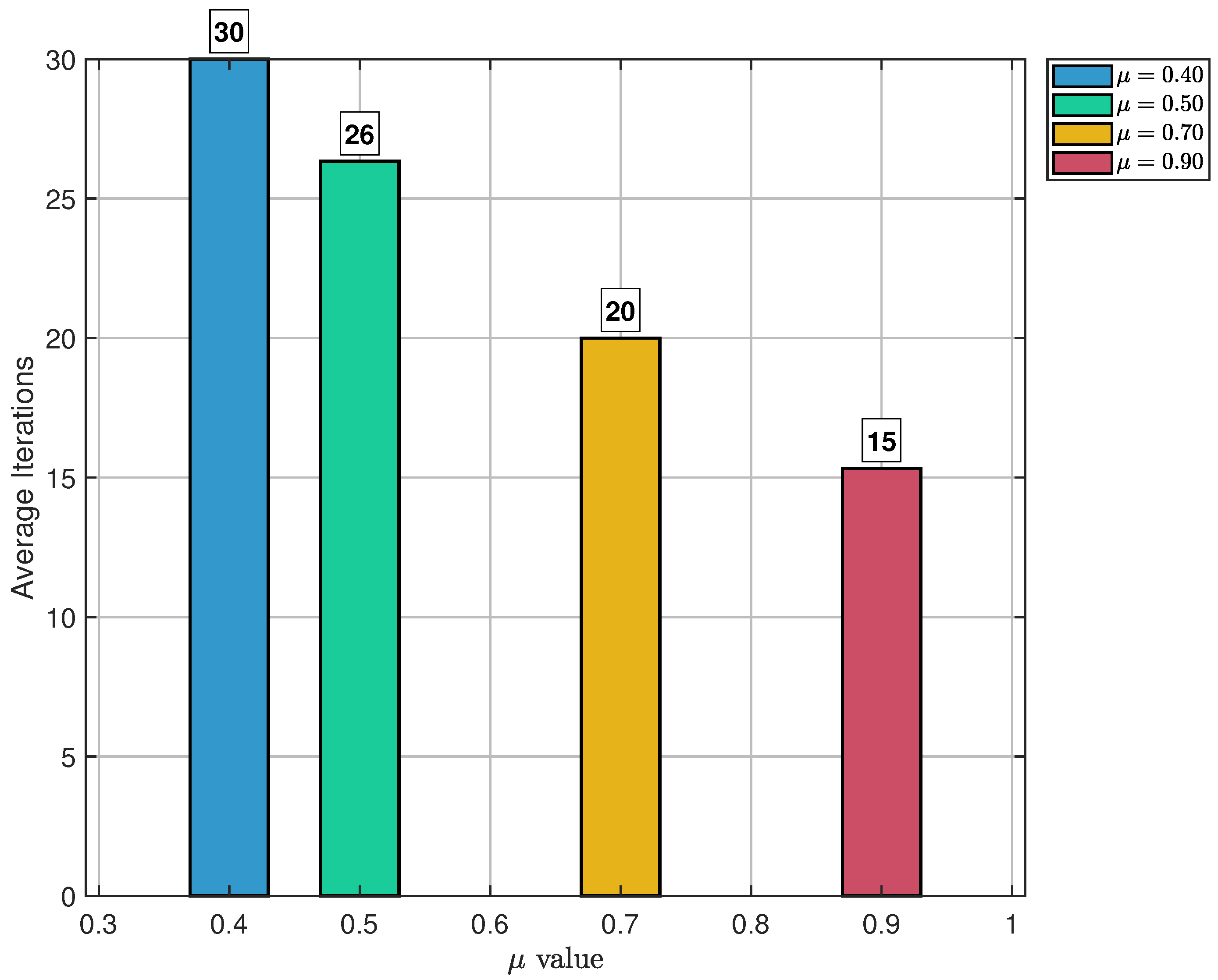 Figure 7 displays a bar chart comparing the average number of iterations required for convergence across multiple initial points. Each bar corresponds to one algorithm, with numeric labels indicating exact averages. The proposed algorithm requires the lowest average number of iterations to achieve convergence, establishing it as the most efficient method. The performance comparison summarized as in