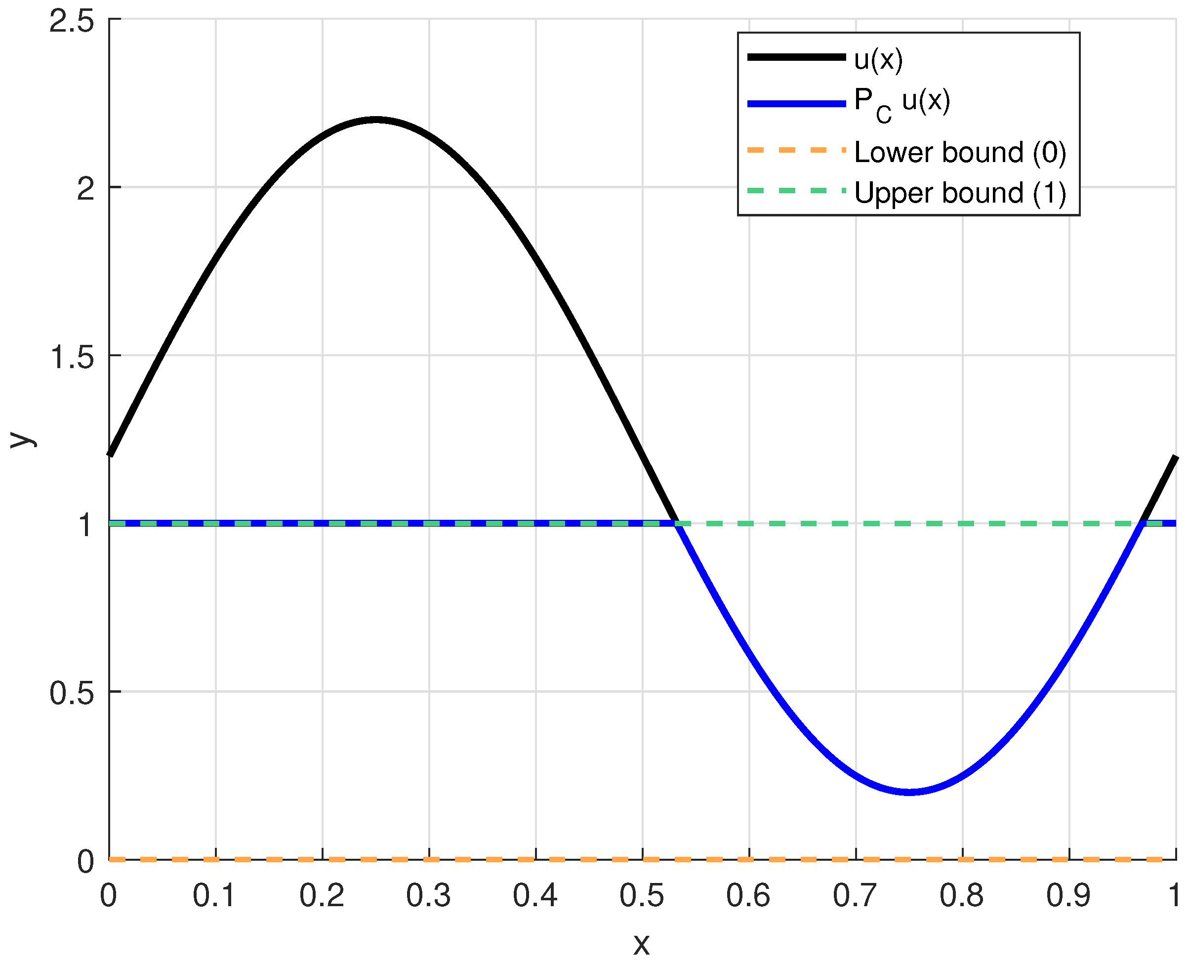Example 2. We now consider the Hilbert space with the inner productFunctions are discretized over N uniform grid points, and the norm is approximated by the discrete -norm Consider and the projection mapping onto is defined pointwise for any function asAlso, the projection is expressed in Figure 13. We define the operators , and where the target function is . The iteration step applies and then projects the result onto via . Since is the identity, . The HFPP conditiontogether with the contraction and the projection , leads numerically to the solution , Thus, the generating sequence convergence weakly to 0.2. 4.2. Application in Image Reconstruction