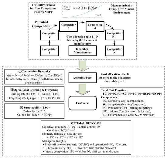 The market environment is further complicated by time-dependent competitor entry, where new firms enter the market following a nonhomogeneous Poisson process (NHPP) with an increasing intensity function . This represents the realistic progression of competitive dynamics: as the product and technology mature, market transparency increases and entry barriers diminish, resulting in an accelerating influx of competitors. The expected number of entrants within a predetermined planning horizon is given by the cumulative intensity function . Consequently, the effective demand faced by the incumbent declines exponentially by a factor , capturing market erosion mitigated through cost-sharing and joint defensive actions between the production stages. The overall framework of this study is illustrated in Figure 1.