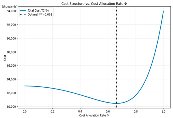 The resulting optimal cost-allocation rate and the corresponding minimum total cost were determined to be = 0.661 and = $80,440,900, respectively. Figure 2 and Figure 3 illustrate the total cost and individual cost components as functions of the allocation rate, while Table 3 provides additional numerical details.