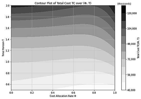 Figure 5 illustrates the contour plot of the total cost TC(Φ,T) as a joint function of the cost allocation rate (Φ) and the planning horizon (T). The contour surface exhibits a smooth convex pattern that gradually rises with longer horizons, indicating that total cost increases as the planning window expands. The lightest region, representing the minimum cost zone, forms a shallow ridge around ≈ 0.6–0.8, suggesting that the optimal allocation ratio remains relatively stable across the examined time horizon T ∈ [0.6, 2.0]. This stability implies that the alliance’s cost-sharing equilibrium is robust with respect to temporal variations—moderate extensions or contractions of the planning period do not significantly alter the optimal allocation rate. From a managerial perspective, such time-invariant behavior allows firms to maintain consistent cost-sharing agreements without frequent renegotiation, even as production cycles evolve. The convex and well-behaved structure of the contour map further validates the model’s theoretical assumption of a unique, stable minimum, reinforcing both analytical soundness and practical applicability.