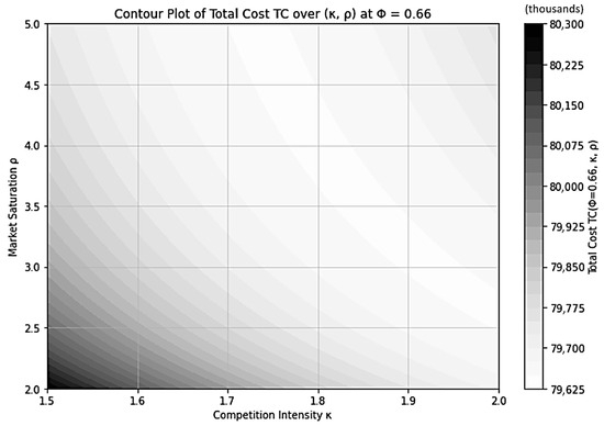 Figure 6 illustrates the contour distribution of the total cost at a fixed allocation rate of Φ = 0.66. The contour surface reveals that cost levels vary smoothly across the joint space of competition intensity () and market saturation (). The lighter central region represents the lowest total cost zone, indicating the most efficient combination of moderate competitive intensity and market maturity. In contrast, the darker regions located in the lower-left and upper-right corners correspond to higher total cost areas. The pattern suggests that when both market saturation and competition intensity deviate from moderate levels—either through overly aggressive competition with limited market reach (lower-left) or excessive market expansion under strong rivalry (upper-right)—the system experiences a rise in total cost. This reflects the nonlinear interplay between competitive pressure and market development: alliances operating in highly contested or underdeveloped markets tend to face cost inefficiencies due to defensive overinvestment or underutilized capacity. Managerially, this contour distribution highlights that maintaining a balanced level of market competition and diffusion is critical to sustaining cost efficiency. Alliances can minimize total expenditure by avoiding extremes in competitive intensity or saturation, instead targeting the intermediate region where cooperative learning and defensive coordination yield the greatest stability and economic resilience.