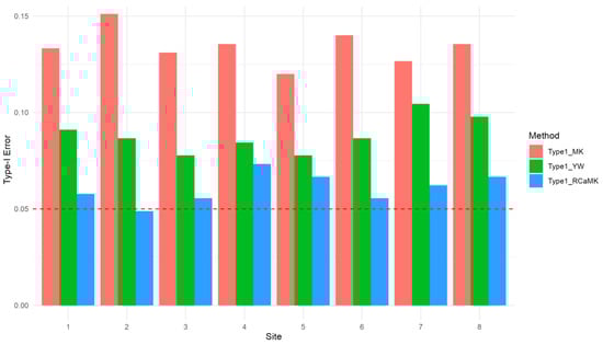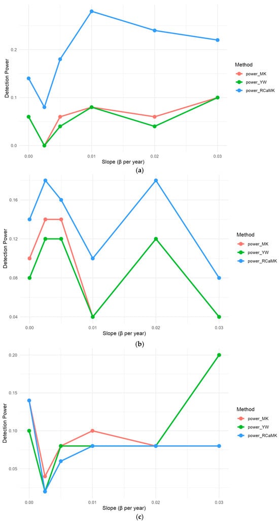 Power analysis for selected sites (Figure 10a–c) reveals method-specific trade-offs. At site 219003 (Figure 10a), R-CaMK power surges from 0.14 (β = 0) to 0.28 (β = 0.01), outpacing both MK (0.08) and Yue–Wang (0.08) at moderate slopes. This advantage stems from R-CaMK’s accurate variance estimation: by correctly modelling dependence, the method avoids variance inflation artefacts that plague classical tests. At larger slopes (β ≥ 0.02), power stabilises near 0.22–0.24, reflecting the site’s moderate variance (Var(S) ≈ 41,600).