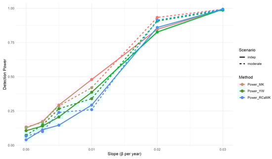 Site 215004 (Figure 10c) shows Yue–Wang dominance at large slopes (power = 0.20 at β = 0.03 versus R-CaMK = 0.08), but this reverses at smaller slopes where R-CaMK maintains 0.06–0.08 versus YW ≈ 0.02–0.08. The crossover reflects YW’s univariate focus: it corrects temporal autocorrelation but ignores spatial dependence, yielding overconfident inference (inflated power via underestimated variance) when β is large. R-CaMK’s conservative power at β = 0.03 suggests that the bootstrap correctly accounts for joint variability, preventing false positives.