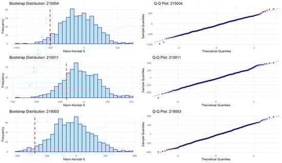 Bootstrap diagnostics for ILP-selected sites (210022, 215004, and 219003): null distributions of Mann–Kendall S (left), observed values in red, and normal QQ plots (right) validating the Gaussian approximation of bootstrap replicates.