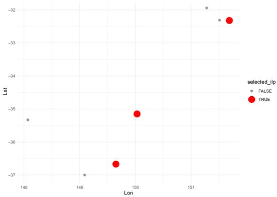 This selection is robust to moderate perturbations. Sensitivity analysis confirms that swapping site 215004 for site 222004 (wj = 0.00177) reduces the total objective by <10%, suggesting a plateau in the optimisation landscape. However, excluding site 219003 (top-ranked) degrades performance by >40%, underscoring its criticality. Geographically, the selected sites span the study domain (Figure 9), ensuring spatial coverage while maximising detection efficiency, a balance unattainable via ad hoc site selection.