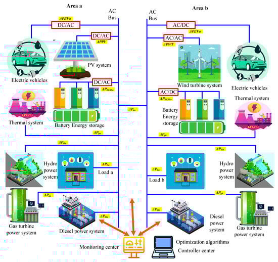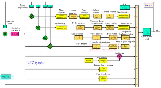 The grid’s electrical connectivity is an important component for successfully generating sufficient power to supply a large number of households and businesses. Power transformers, towers, transmission lines, electricity-generating facilities, and multiple relaying units make up the majority of electrical systems. Reliable generation and transmission of electricity to various end users is the system’s goal. In order to achieve maximum simplicity, the electrical systems use collections of pools, each of which has been identified as an electrifying region []. Typically, a number of electrification zones or sections are assembled to form the advanced power system network. The flow of electricity across different electric zones is facilitated by the common power line []. Despite having the capacity to control energy transition, the network experiences a considerable loss of power. Effective operations and network capacity have a major impact on the system’s consistency. Keeping the network’s overall power consumption in line with its gross generation is part of operating dependability. The grid will no longer be reliable in the event of a power balance disturbance. A number of disturbances, including overloads, power outages, sudden changes in demand, and more, are the primary sources of power balance problems that cause grid frequency uncertainty []. By consistently balancing the production and consumption of energy, the electric system typically assures its steady and dependable process. The power interaction between efficient consumption and efficient production maintains the consistent frequency of the electrical component. Power engineers must balance generation and load since there is regularly a steady oscillation in the electrical system’s application demand []. This comparative balance continually disturbs the system frequency, which in turn affects the safety of operation of the electrical system. The basic methods used to control the frequency of the entire electrical environment are the major and subsidiary regulators. The automated generation control (AGC)/LFC network regulates the energy production in the power system without regard to net electricity consumption [], such as in Ref. [] that developed the LFC feature in one area power systems.