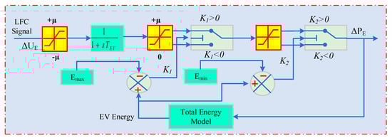 To model the collective behavior of EVs across stations with varying populations, an equivalent EV model with aggregated inverter capacity can be employed. This approach, as proposed in [] for LFC studies, is illustrated in Figure 3. The model incorporates T_e as its time constant and ΔU_E as the LFC command signal. The inverter’s power capacity is well-defined via the range ±μ.