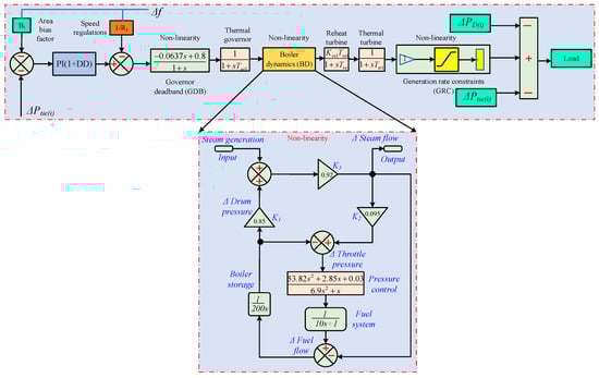 The BD transfer-function model in Figure 4 incorporates the combustion control system and can be used for gas/oil units with modest ignition accuracy as well as coal-fired plants with strict ignition control. Most steam power plants regulate output via turbine control valves. When deviations in steam pressure or flow are detected, the boiler control system acts promptly to restore stability. Figure 4 presents the equivalent BD transfer-function model []. The LFC system with three important nonlinearities, GBB, BD, and GRC is shown in Figure 4. The system incorporates these nonlinear components to reflect practical limitations on frequency regulation. The signal flow progresses from the thermal governor through the governor deadband, then into the boiler and turbine dynamics. The GRC, which reflects constraints in the generating rate, is applied just prior to the load. Accurately replicating the system’s dynamic reaction under real-world operational situations requires this thorough model.