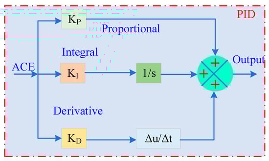 This study used a fuzzy-PID controller to examine two test systems. In Figure 7, the controller’s structure is depicted []. The scaling factors in this case are KX i and KY i, the first two input gains. After that, fuzzy controller and PID controller are cascaded, with the three PID gains being KP i, KI i, and KD i. To attain better results, the controller’s gains need to be adjusted. The ACE and its derivative, ∇ACE, are included in the input signal that this fuzzy controller receives. The corresponding ACEs provided by the following serve as the error inputs to the controllers: