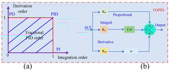 where Kp, Ki and Kd are the proportional, integral and derivative gains, and λ and μ denote the fractional orders of the integral and derivative actions, respectively. In this work, λ and μ are treated as tunable design variables and are restricted to the interval 0 < λ ≤ 1, 0 < μ ≤ 1, which is consistent with standard FO–PID practice and avoids excessively aggressive integral or derivative behavior. Decreasing λ reduces the effective low-frequency gain and integral memory, which mitigates overshoot at the expense of a slower offset removal, whereas increasing λ makes the integral action more dominant. Similarly, the parameter μ controls the strength and bandwidth of the derivative action: larger μ improves damping and accelerates the transient response, while smaller μ yields a more conservative derivative effect with increased robustness to noise.