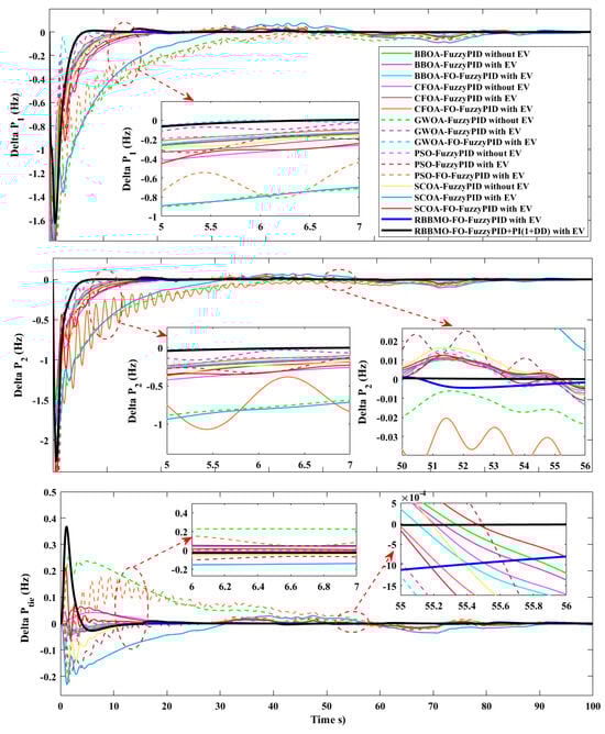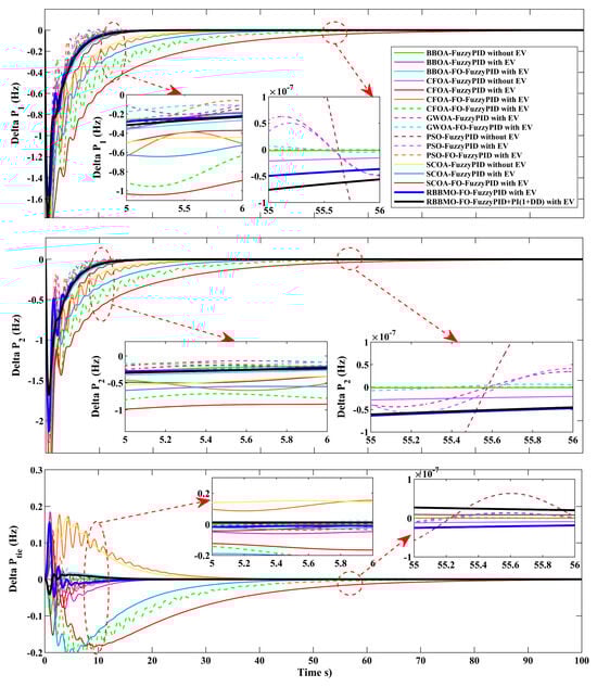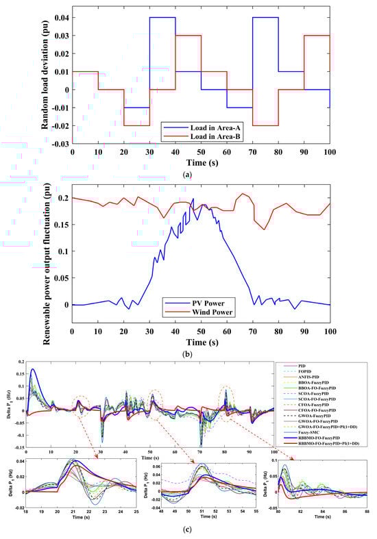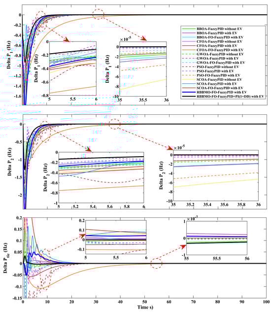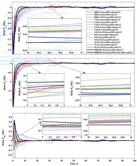 This research’s main objective is to improve LFC in contemporary power networks with significant renewable penetration. We handle the stochastic demand and renewable generation variability by using State of Charge-aware EV aggregation as quick, bidirectional support and co-designing a FO-fuzzy-PID controller enhanced with an auxiliary PI(1+DD) method. The hybrid controller is tuned via RBBMO and benchmarked against PSO, GWOA, SCOA, CFOA, and BBOA, yielding tighter transient envelopes (lower over/undershoot), shorter settling, and negligible steady-state error, even under renewable ramps, Area-2 contract violations, and 3% GRC. This flexibility is critical for real-time stability as renewable adoption grows, and it points to a practical pathway for robust, multi-area frequency regulation.
