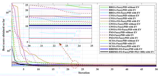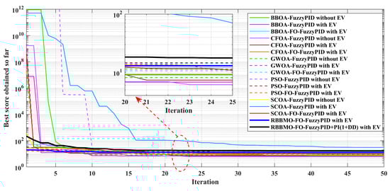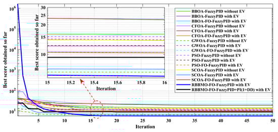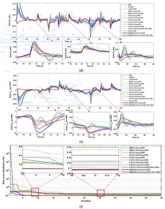 In the proposed hybrid controller, the FO-FuzzyPID and PI(1+DD) branches play complementary roles that cannot be replicated by either component alone. The FO-FuzzyPID branch acts directly on the ACE through fuzzy rules embedded in a fractional-order structure, which provides nonlinear, memory-aware shaping of the error: the fuzzy layer modulates the effective proportional and derivative actions according to the operating condition, while the fractional integral order adjusts the depth of past-error memory, jointly yielding low overshoot and robustness to modeling uncertainty. In parallel, the auxiliary PI(1+DD) branch introduces a linear damping channel that reacts more aggressively to rapid frequency excursions via the derivative–derivative term, yet maintains a conventional PI backbone to preserve zero steady-state error. The two branches therefore operate on partially decoupled time scales, with the FO-FuzzyPID path governing smooth, robust set-point tracking and the PI(1+DD) path enhancing disturbance rejection and oscillation suppression. The RBBMO optimizer then coordinates these effects by jointly tuning the gains and fractional orders so that the combined response achieves faster settling, smaller nadir and improved resilience to RES/ESS and EV-induced disturbances compared with single-branch FO-PID, stand-alone ANFIS or fuzzy-SMC alternatives.