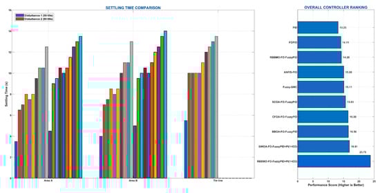 To address the LFC issue in power MGs, a number of management controllers have been proposed in recent decades. System performance has been demonstrated to be improved by these controllers, which include proportional (P) [], integral (I) [], proportional derivative (PD) [], and proportional integral (PI) []. These techniques, however, frequently lack resilience against parameter uncertainties and have limited capacity to mitigate disturbances. Advanced research controllers that can manage numerous variables, like fractional-order PID (FOPID) [], PID-acceleration (PIDA) [], and two-stage IPD with one plus integral (IPD-(1+I)) [], provide improved disruption mitigation performance. FOPID [,], FO-IDF by filter [], and PI-tilt-derivative through filter (PI-TDF) [] are examples of additional controllers that exhibit enhanced high-frequency deviation mitigation and disturbance rejection. These controllers, however, need more intricate calculations and longer processing durations [].