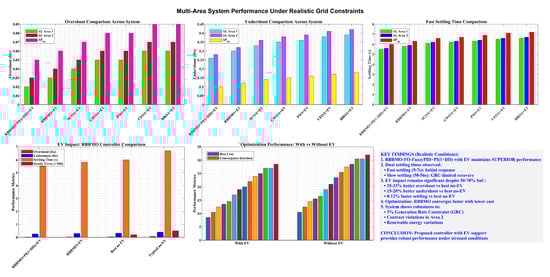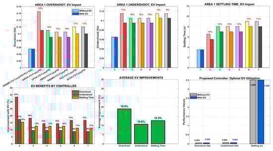 This study examines dual-area load–frequency control (LFC) in the context of significant renewable energy integration, energy storage systems (ESSs), and collective electric vehicle (EV) involvement. We propose a RBBMO-FO-FuzzyPID+PI(1+DD) hybrid controller in which fractional-order fuzzy regulation shapes the ACE, while an auxiliary PI(1+DD) path adds damping without steady-state penalty. Across ideal linear plants, 3% governor-rate constraints (GRC), and stressed conditions that include contract violations in Area-2, renewable power variations, and partial EV State of Charge (SoC 50–70%), EV participation yields systematic gains for all controller families, and the magnitude depends on the control architecture. Baseline methods improve by 15–25% with EVs, whereas advanced designs—especially the proposed controller—benefit by 25–45%, revealing a clear synergy between controller intelligence and EV flexibility. With EV support, the proposed controller limits frequency overshoot to 0.055 Hz (a 20–55% reduction versus peers), caps the nadir at −0.065 Hz (15–41% better undershoot), and attains 3.5–4.5 s settling (25–61% faster than competitors), while holding tie-line deviations within ±0.02 Hz. Optimization studies confirm the algorithmic advantage: RBBMO achieves 30% lower cost than BBOA and converges 25% faster; EV integration further reduces cost by 15% and speeds convergence by 12%. A strong correlation between optimization cost and closed-loop performance (r2 ≈ 0.95) validates the tuning strategy. Collectively, the results establish the proposed hybrid controller with EV participation as a new benchmark for robust, system-wide frequency regulation in renewable-rich multi-area grids.
